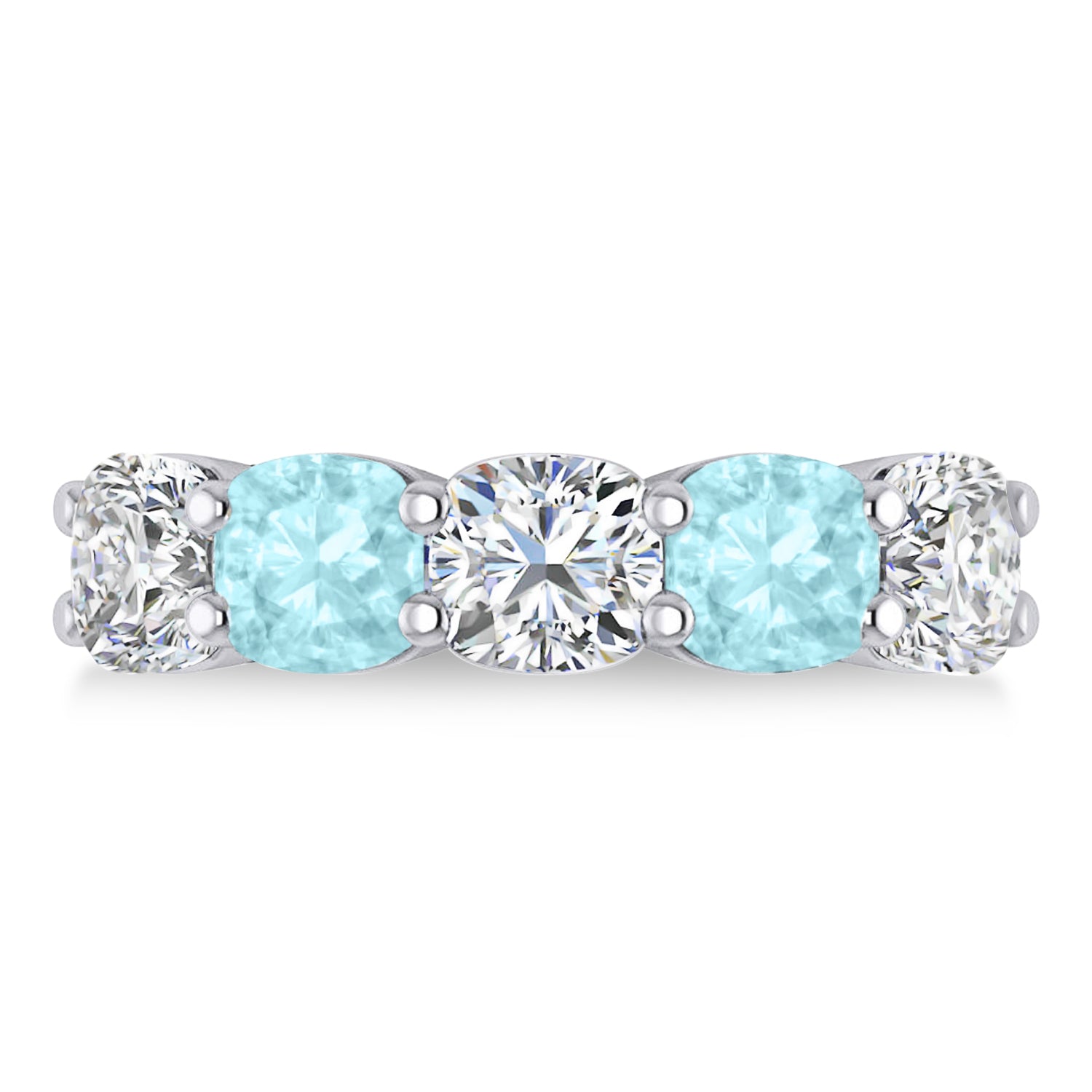 Cushion Diamond & Aquamarine Five Stone Ring 14k White Gold (5.20ct)
