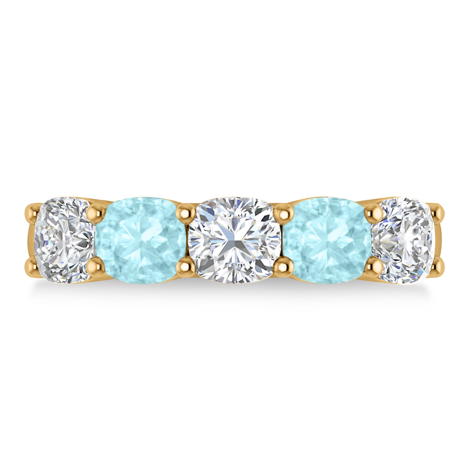 Our 2.70ct cushion diamond & aquamarine five stone wedding band is set to impress, and is crafted of 14k yellow gold. The prong setting ring holds three diamonds, and two aquamarines. The diamonds weigh in at 1.50ct, and are of G-H color and SI1-SI2 clarity. The aquamarines total 1.20ct, and are blue and eye clean. This wedding band will take your look to the next level.