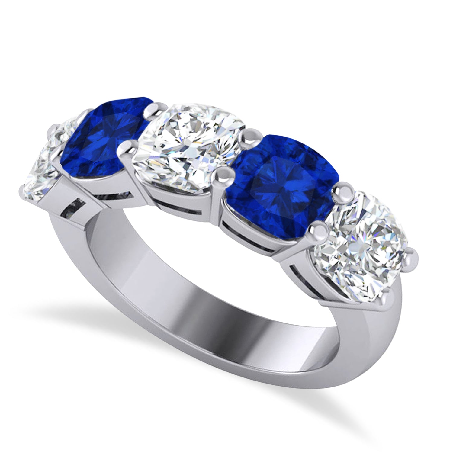 Cushion Diamond & Blue Sapphire Five Stone Ring 14k White Gold (5.20ct)