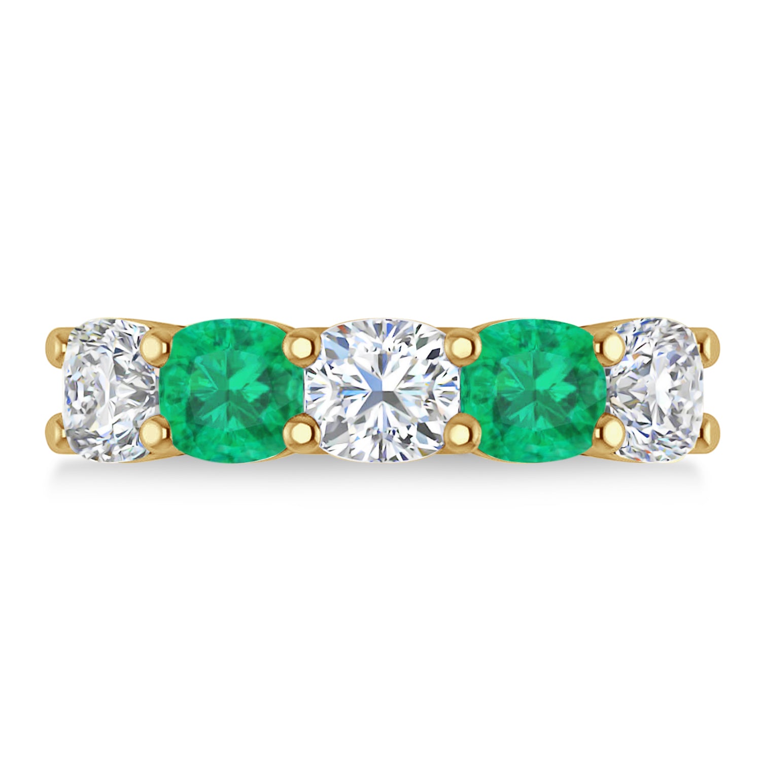 Cushion Diamond & Emerald Five Stone Ring 14k Yellow Gold (4.05ct)