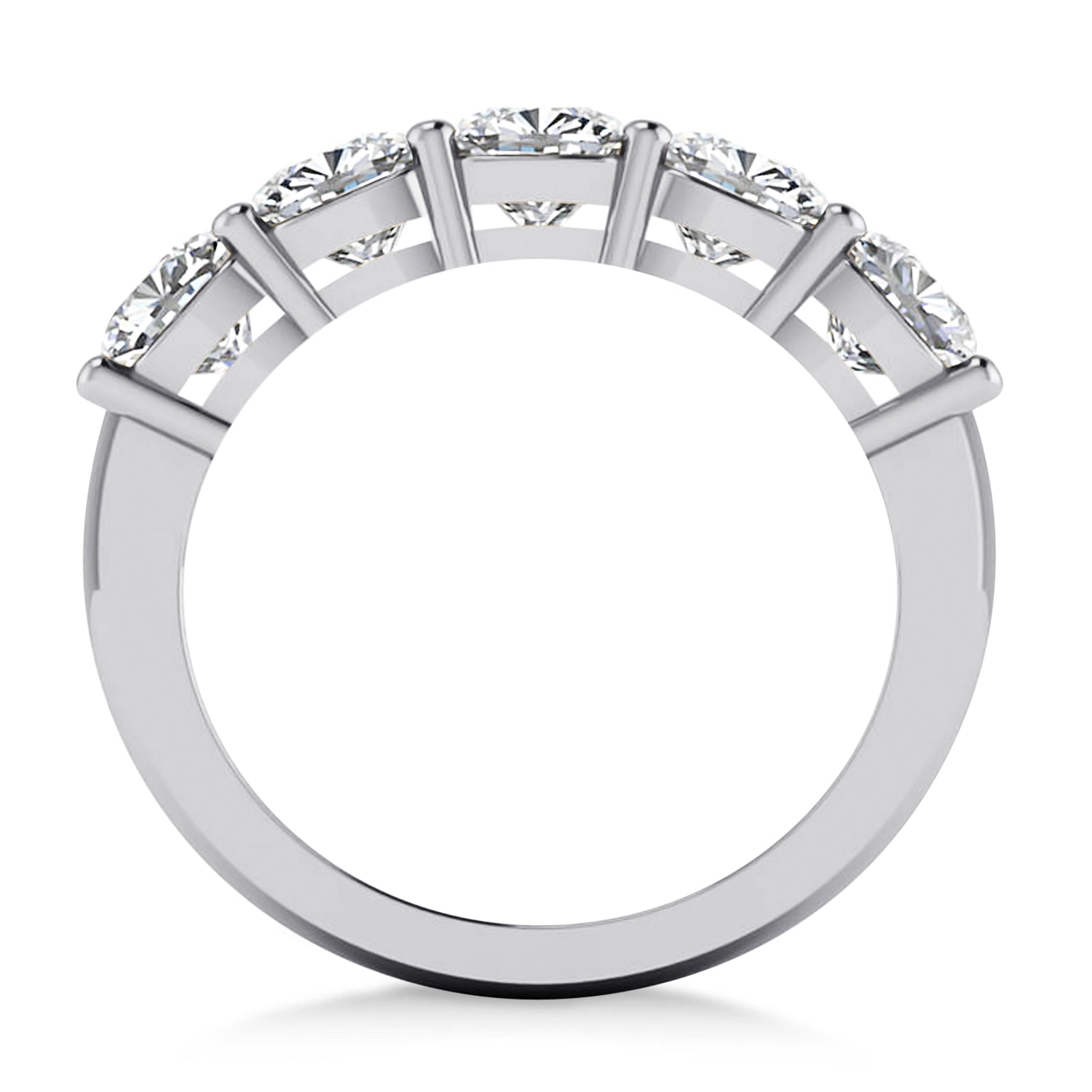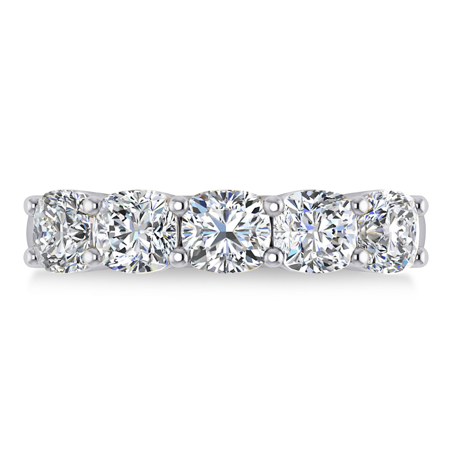 Our 2.50ct cushion diamond five stone wedding band is set to impress, and is crafted of 14k white gold. The prong setting ring holds five diamonds. The diamonds weigh in at 2.50ct, and are of G-H color and SI1-SI2 clarity. This wedding band will take your look to the next level.