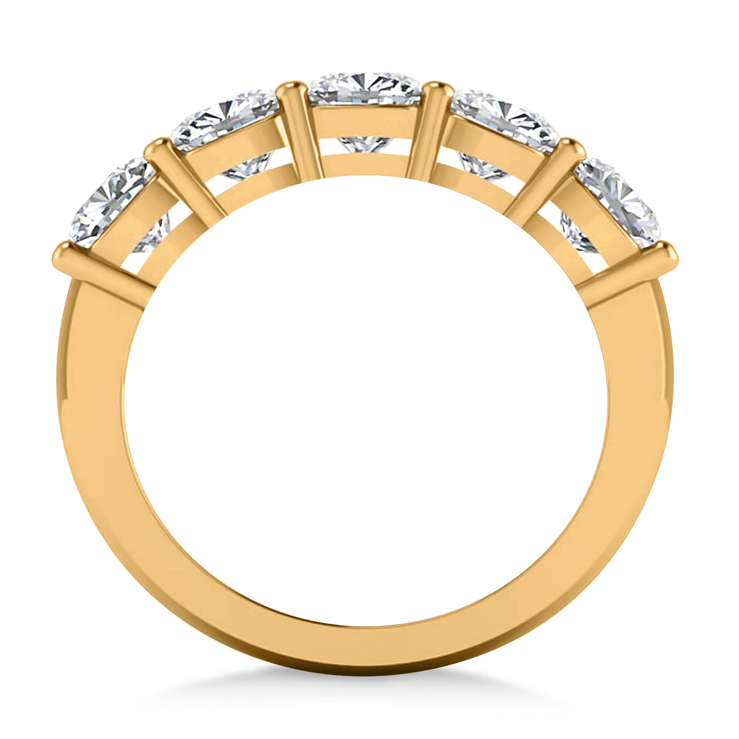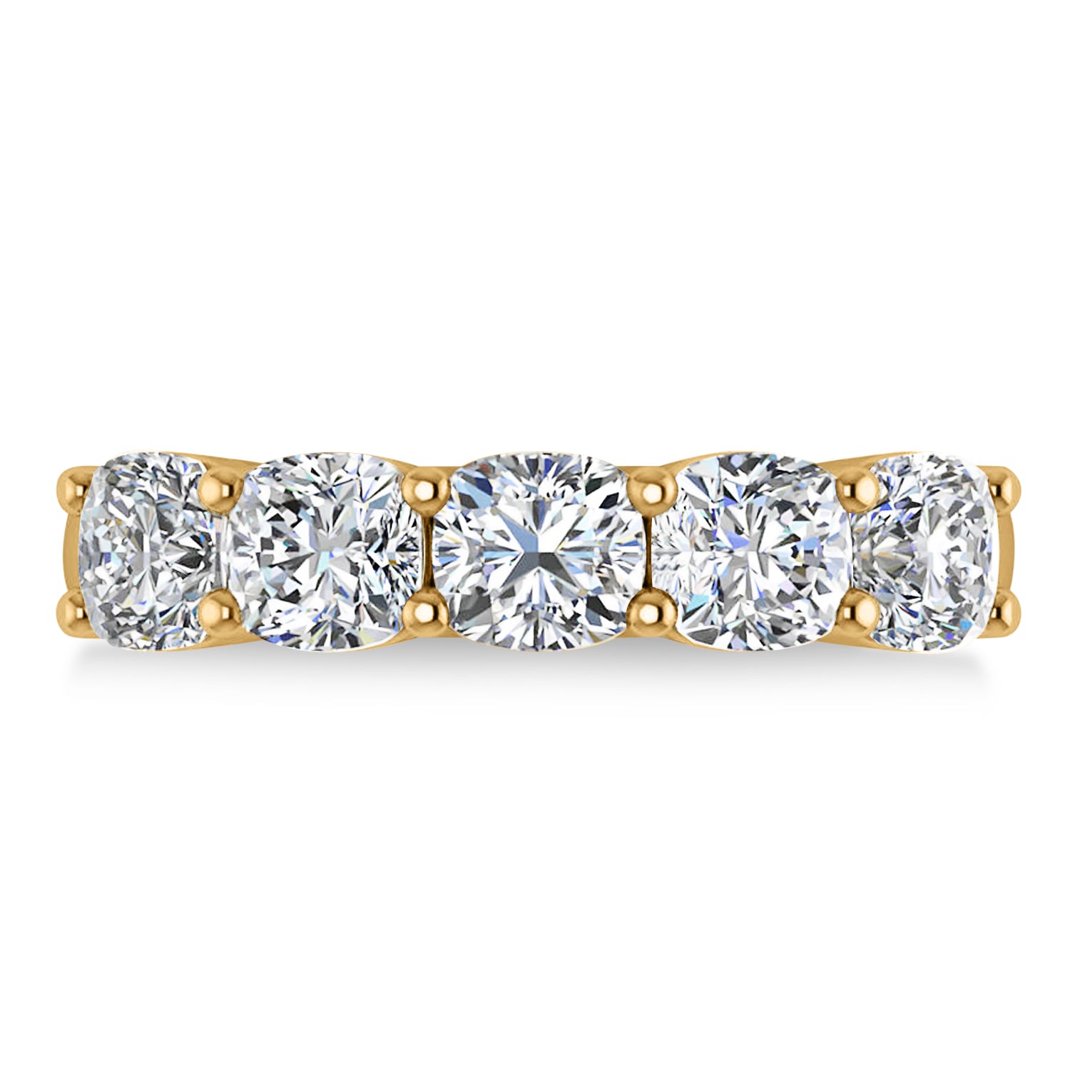 Our 2.50ct cushion diamond five stone wedding band is set to impress, and is crafted of 14k yellow gold. The prong setting ring holds five diamonds. The diamonds weigh in at 2.50ct, and are of G-H color and SI1-SI2 clarity. This wedding band will take your look to the next level.