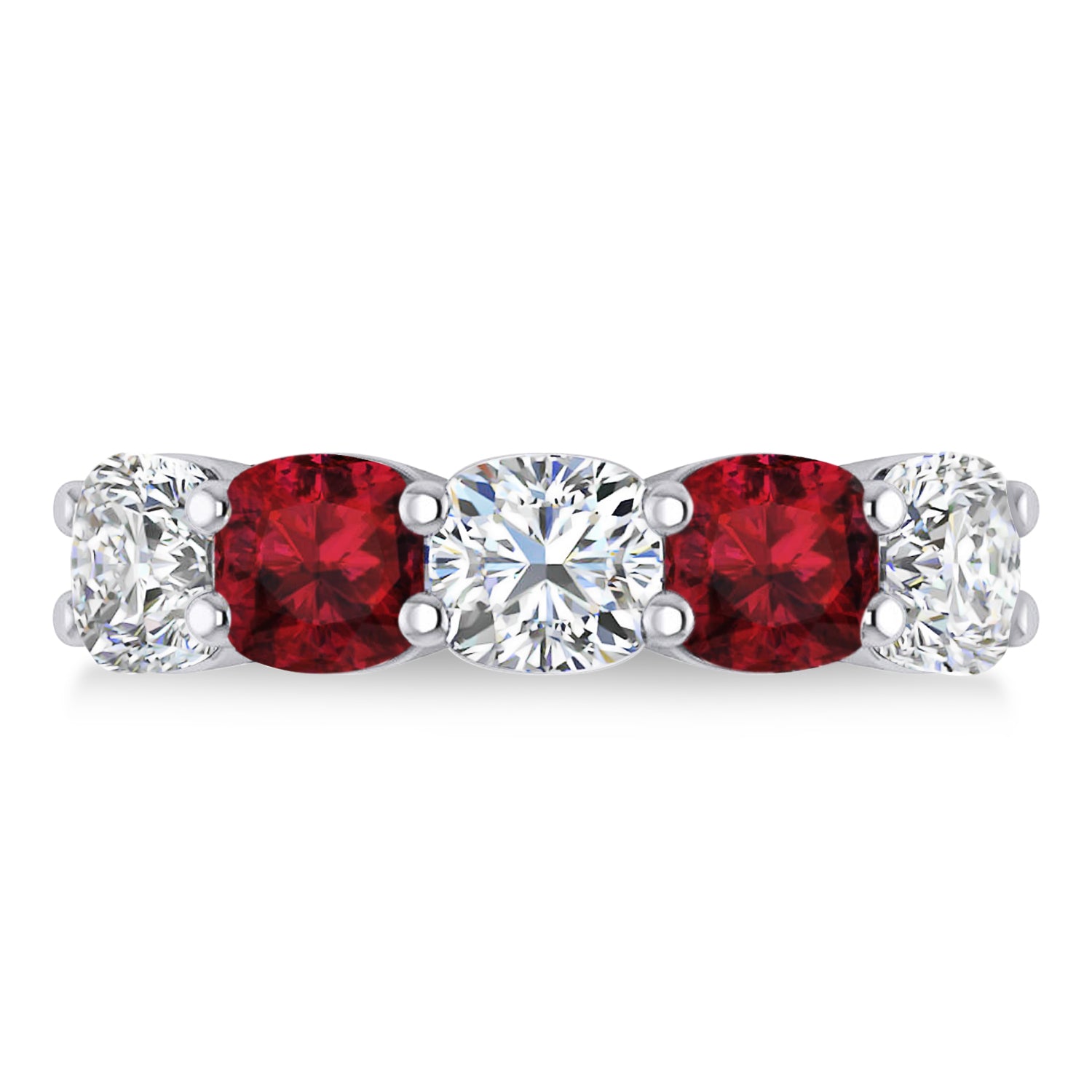 Our 5.20ct cushion diamond & garnet five stone wedding band is set to impress, and is crafted of 14k white gold. The prong setting ring holds three diamonds, and two garnets. The diamonds weigh in at 3.00ct, and are of G-H color and SI1-SI2 clarity. The garnets total 2.20ct, and are red and eye clean. This wedding band will take your look to the next level.