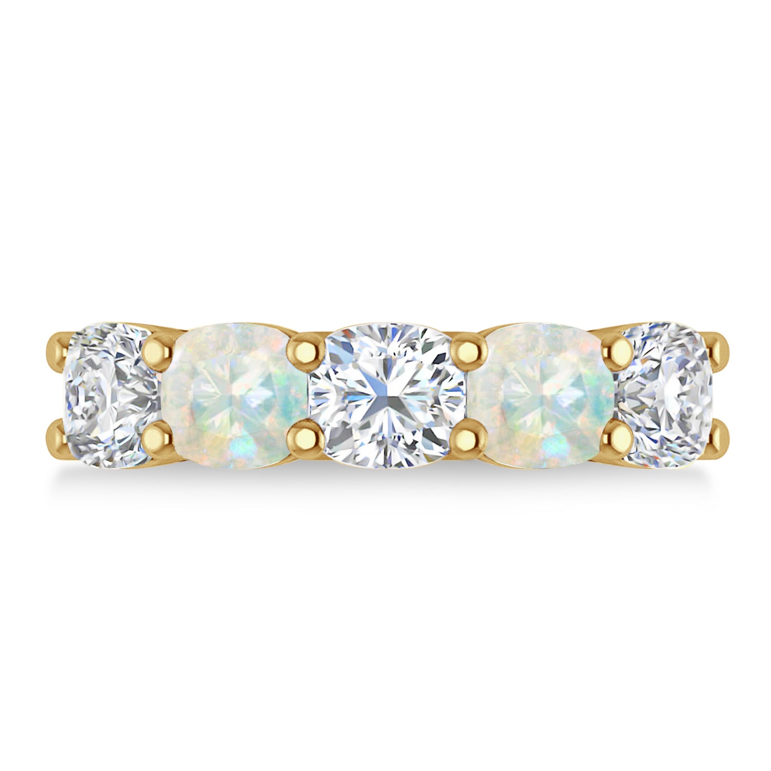 Our 4.05ct cushion diamond & opal five stone wedding band is set to impress, and is crafted of 14k yellow gold. The prong setting ring holds three diamonds, and two opals. The diamonds weigh in at 2.25ct, and are of G-H color and SI1-SI2 clarity. The opals total 1.80ct, and are white and eye clean. This wedding band will take your look to the next level.