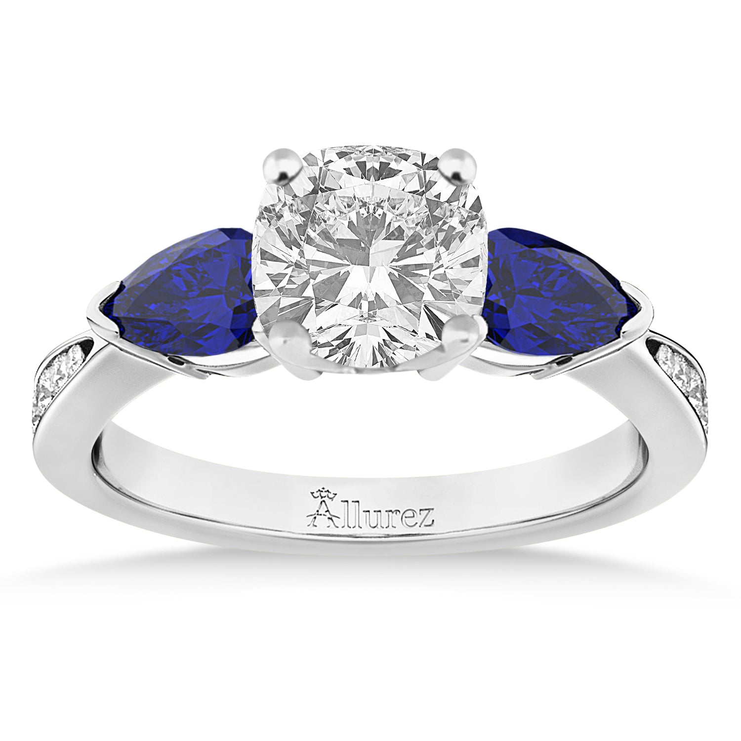 Cushion Diamond & Pear Blue Sapphire Engagement Ring 14k White Gold (1