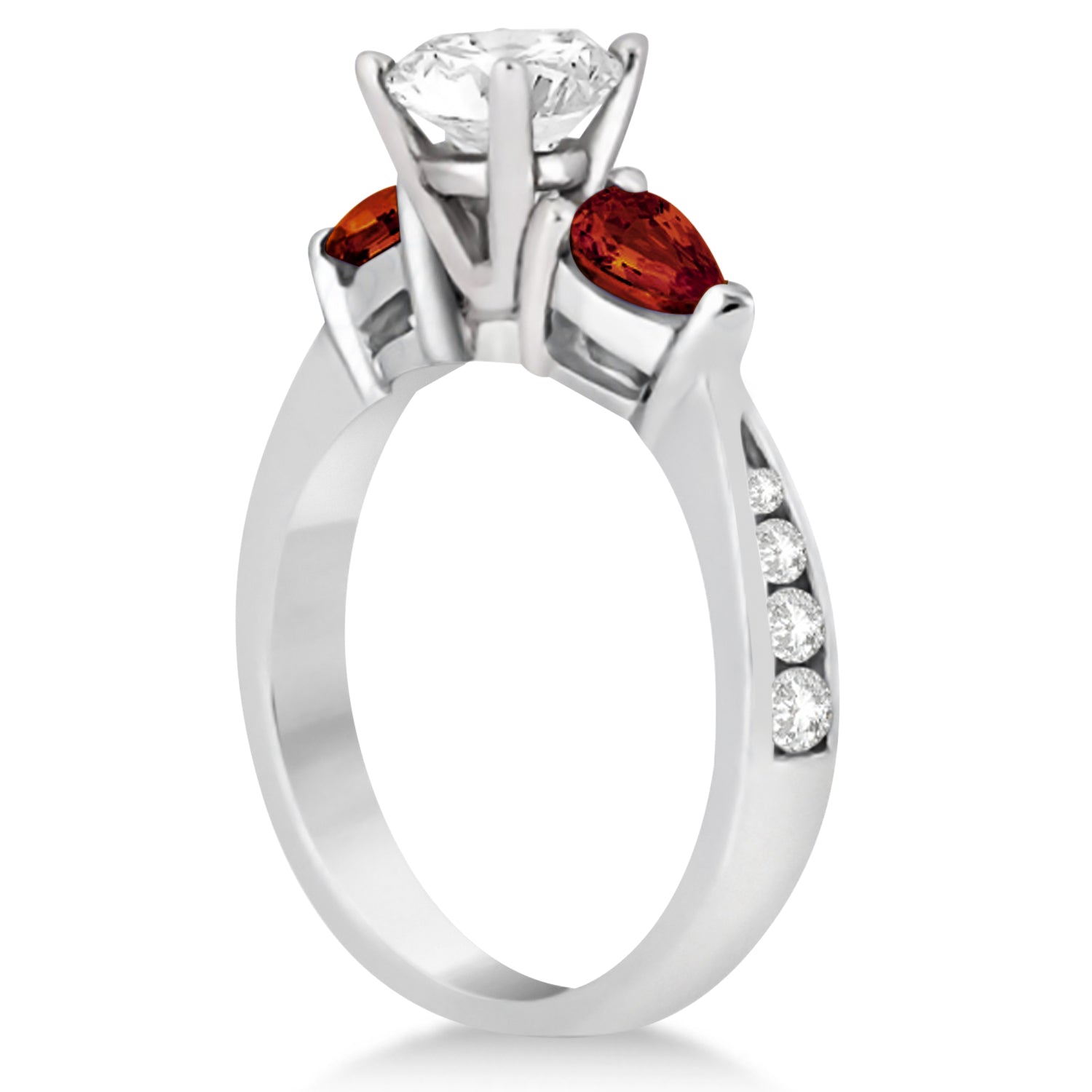 When you're ready to pop the question, surprise her with this fancy three stone side stone accented diamond and garnet engagement ring. The ring also features 2 teardrop pear shaped gemstones which are placed on either side of the approximately 0.50ct cushion center stone.