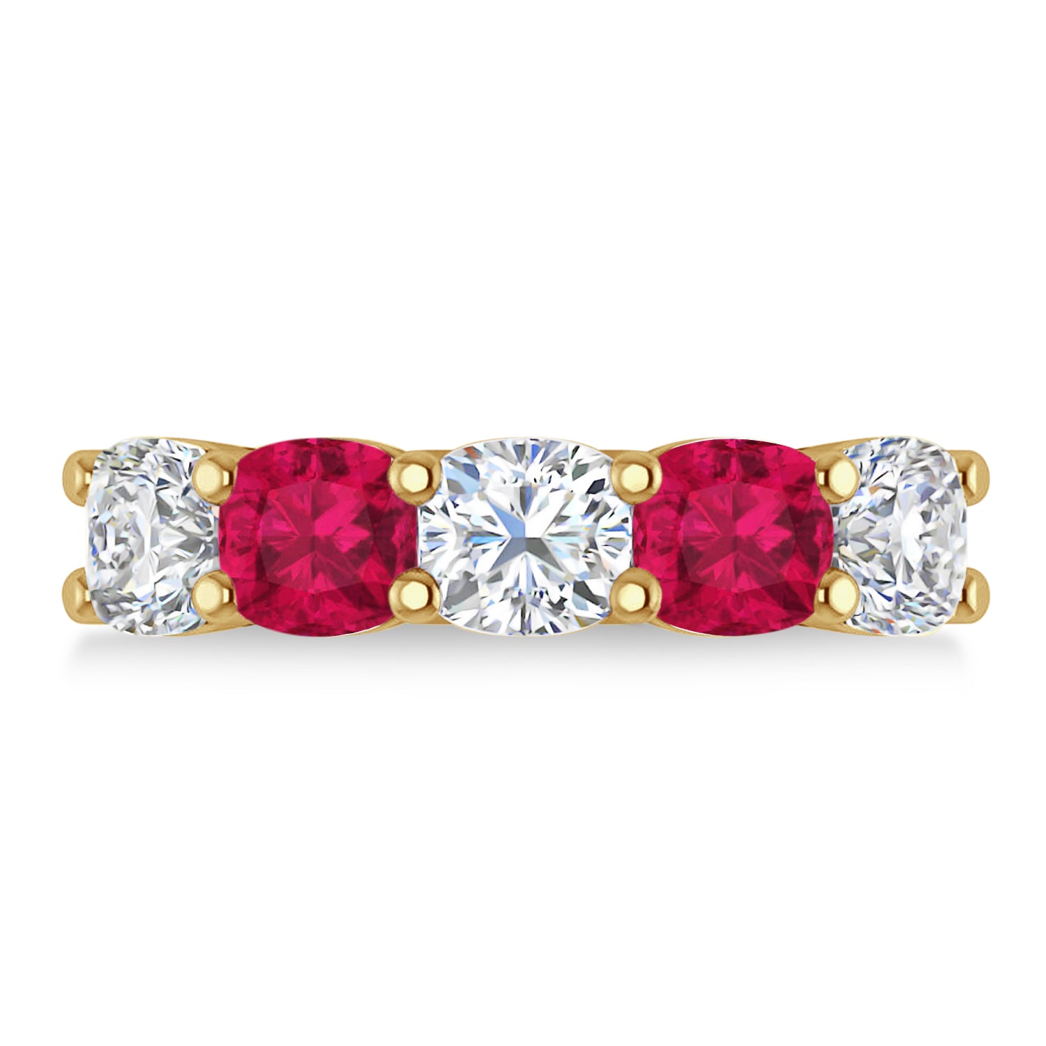 Cushion Diamond & Ruby Five Stone Ring 14k Yellow Gold (4.05ct)