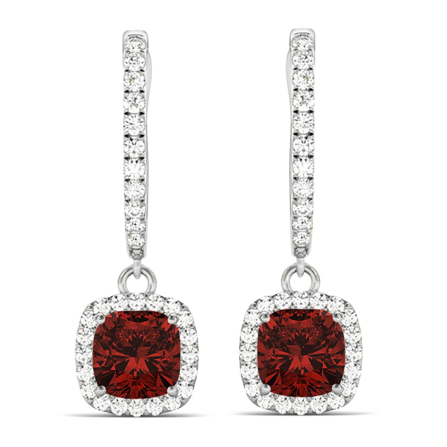 Our Cushion Shape Garnet & Diamond Halo Dangling Earrings come in other metals and are also available set with other precious and semi-precious cushion-shaped stones.