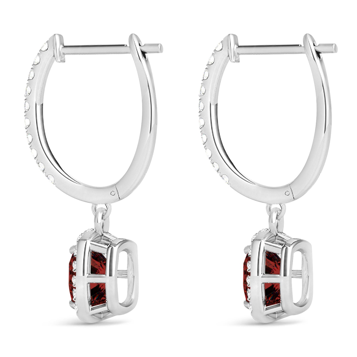 Catch the eye with the beauty of our lab garnet & lab grown diamond halo dangling earrings, featuring cushion-shaped dark red lab garnets showcased within halos of round lab grown diamond accent stones. Each earring is crafted in 14k white gold and secured by a comfortable hinged hoop back.