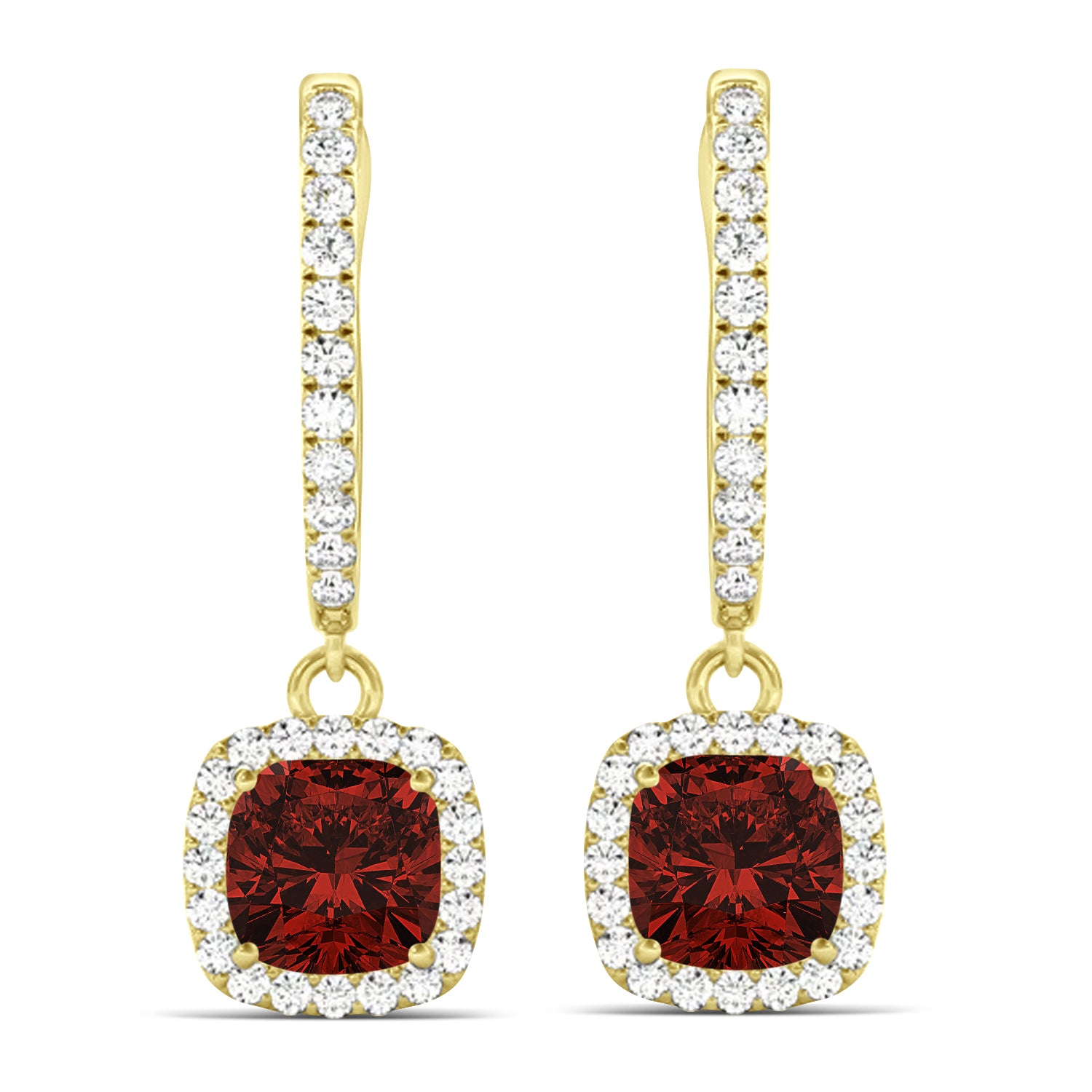 Cushion Lab Garnet & Lab Diamond Halo Dangling Earrings 14k Yellow Gold (2.90ct)
