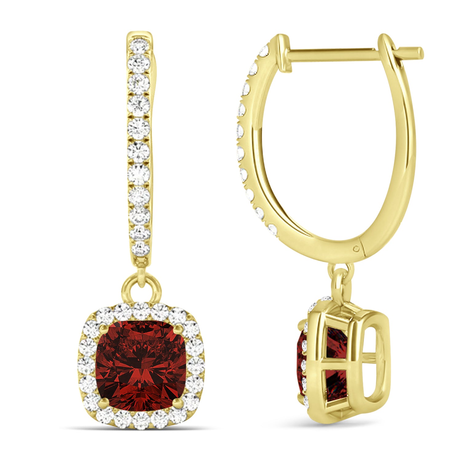 Catch the eye with the beauty of our lab garnet & lab grown diamond halo dangling earrings, featuring cushion-shaped dark red lab garnets showcased within halos of round lab grown diamond accent stones. Each earring is crafted in 14k yellow gold and secured by a comfortable hinged hoop back.