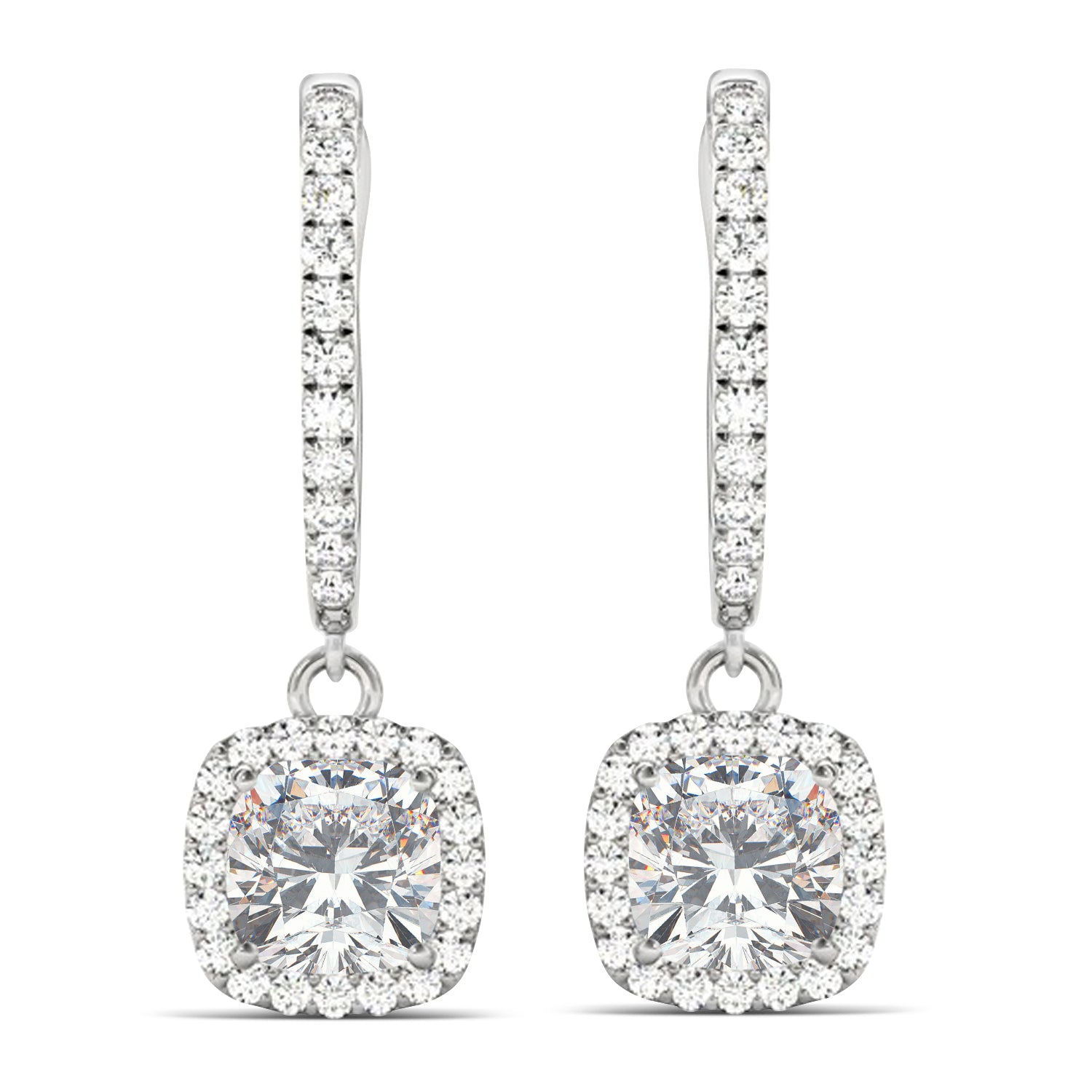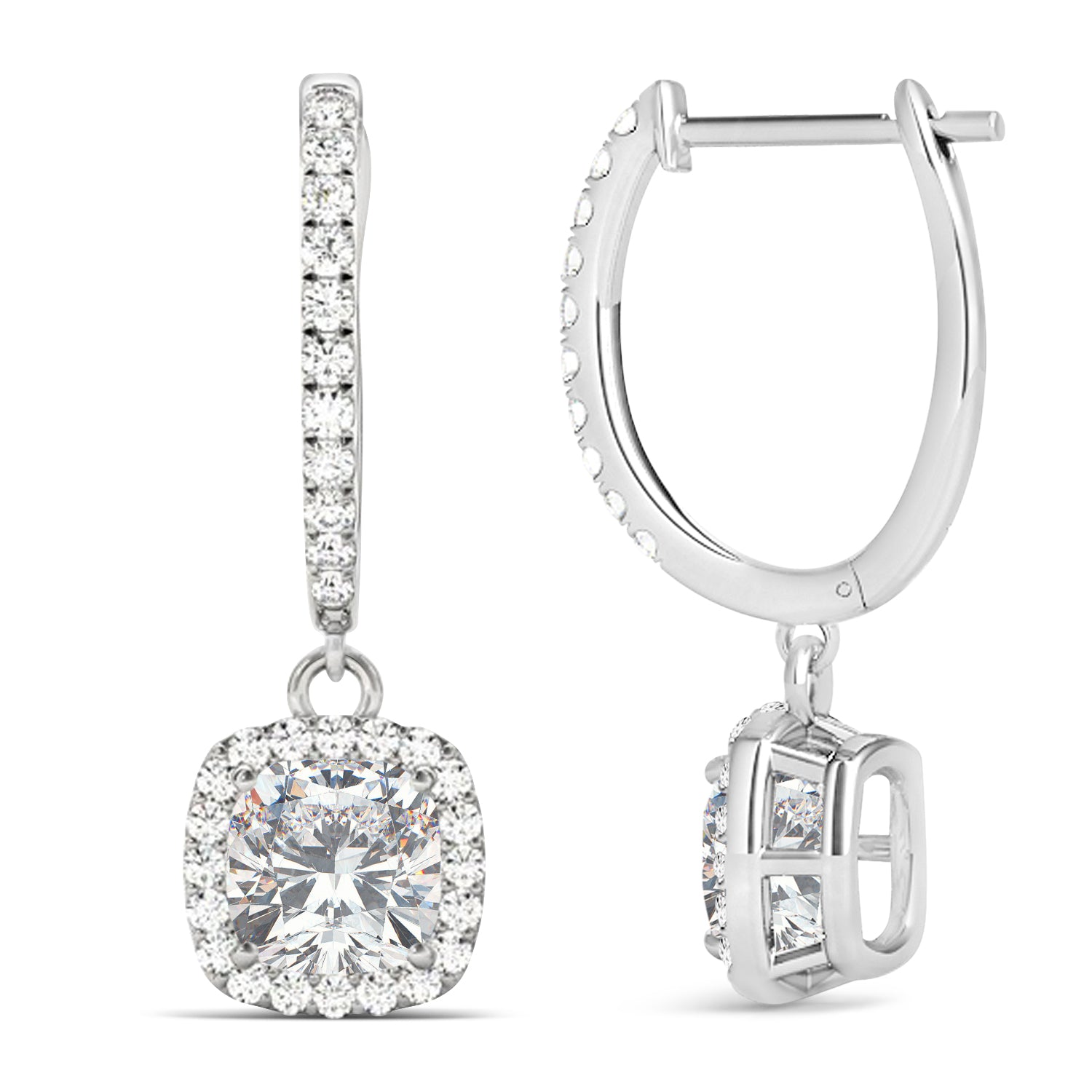 Our Cushion Shape Moissanite & Diamond Halo Dangling Earrings come in other metals and are also available set with other precious and semi-precious cushion-shaped stones.