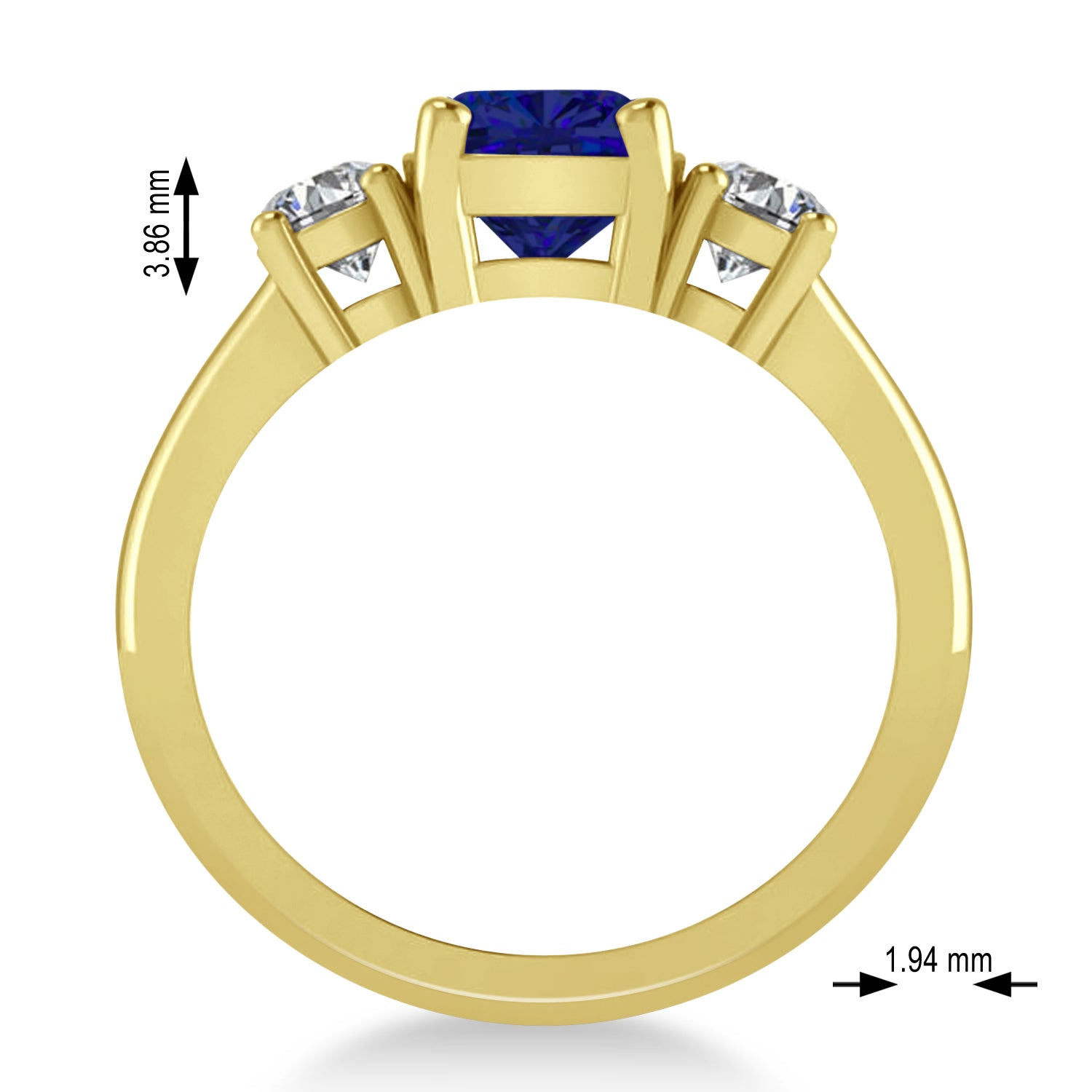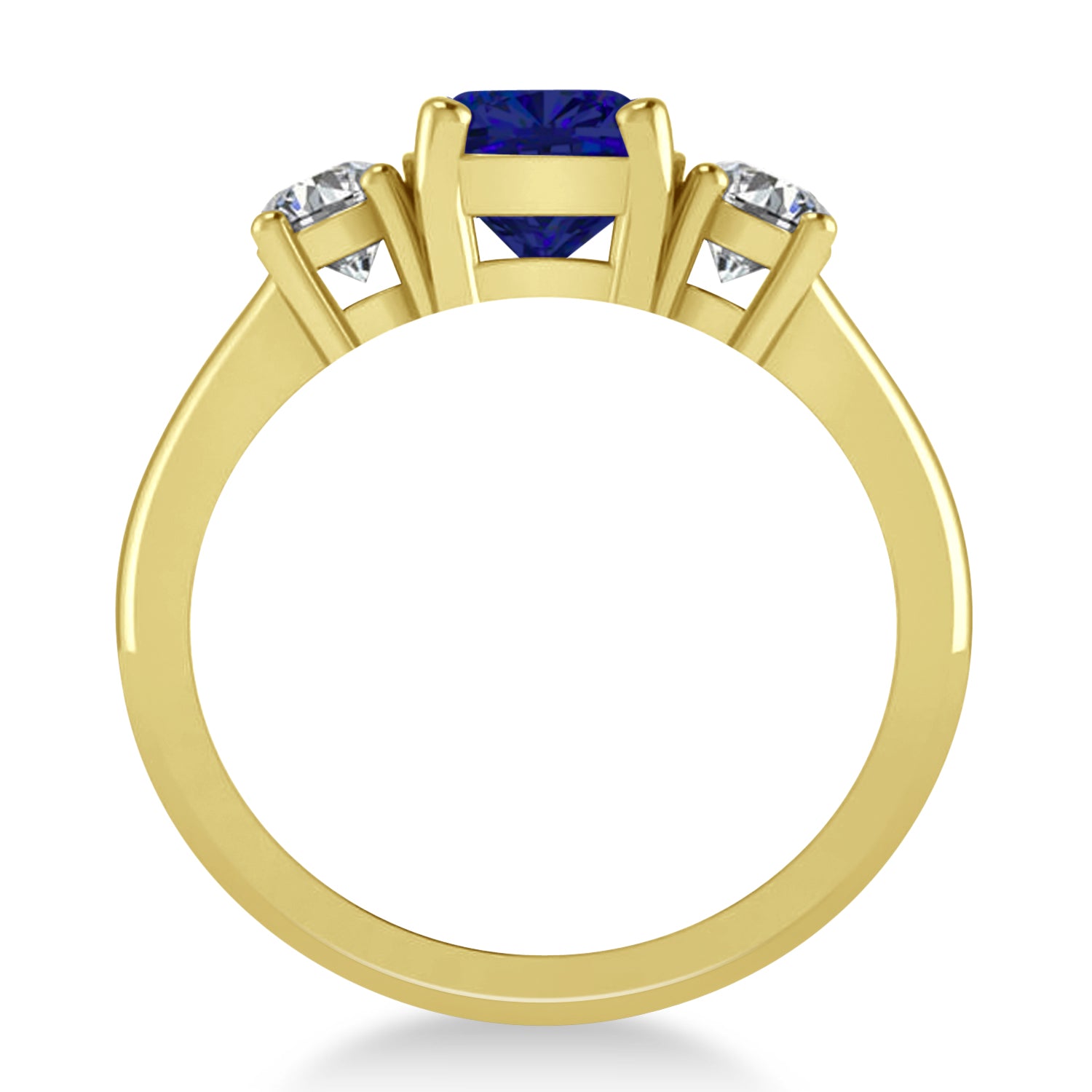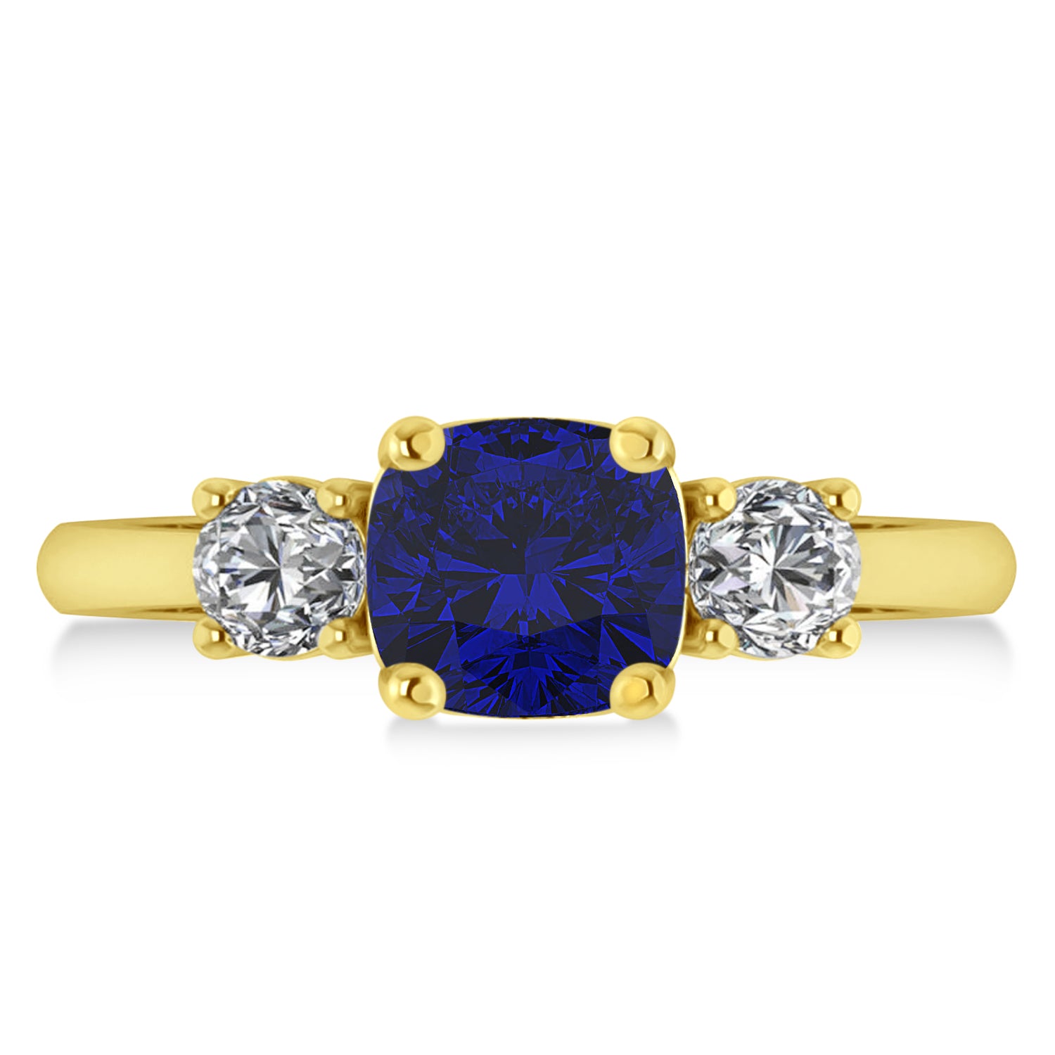 A modern version of a classic style, our cushion and round three-stone blue sapphire and diamond engagement ring features a sparkling two-carat cushion-cut blue sapphire flanked by two round white accent diamonds, all prong set in 14k yellow gold. Sparkling with color and symbolism, the ring's trio of stones represent friendship, love and fidelity. p>All stones are prong set with a combined 2.50 total carat weight. Diamonds are rated G-H for color and SI1-SI2 for clarity; the blue sapphire is of eye-clean clarity.