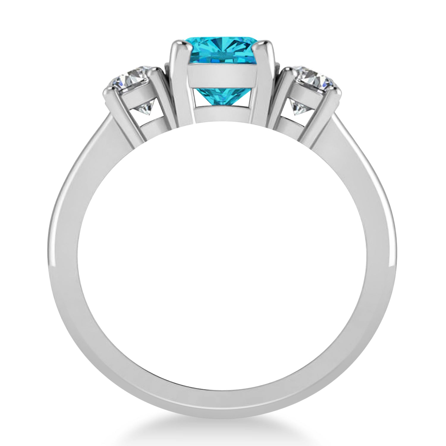 A bold and unique version of a classic style, our cushion and round three-stone diamond engagement ring features a stunning two-carat cushion-cut blue diamond flanked by two round white accent diamonds, all prong set in 14k white gold. Sparkling with symbolism, the ring's trio of stones represent friendship, love and fidelity.
