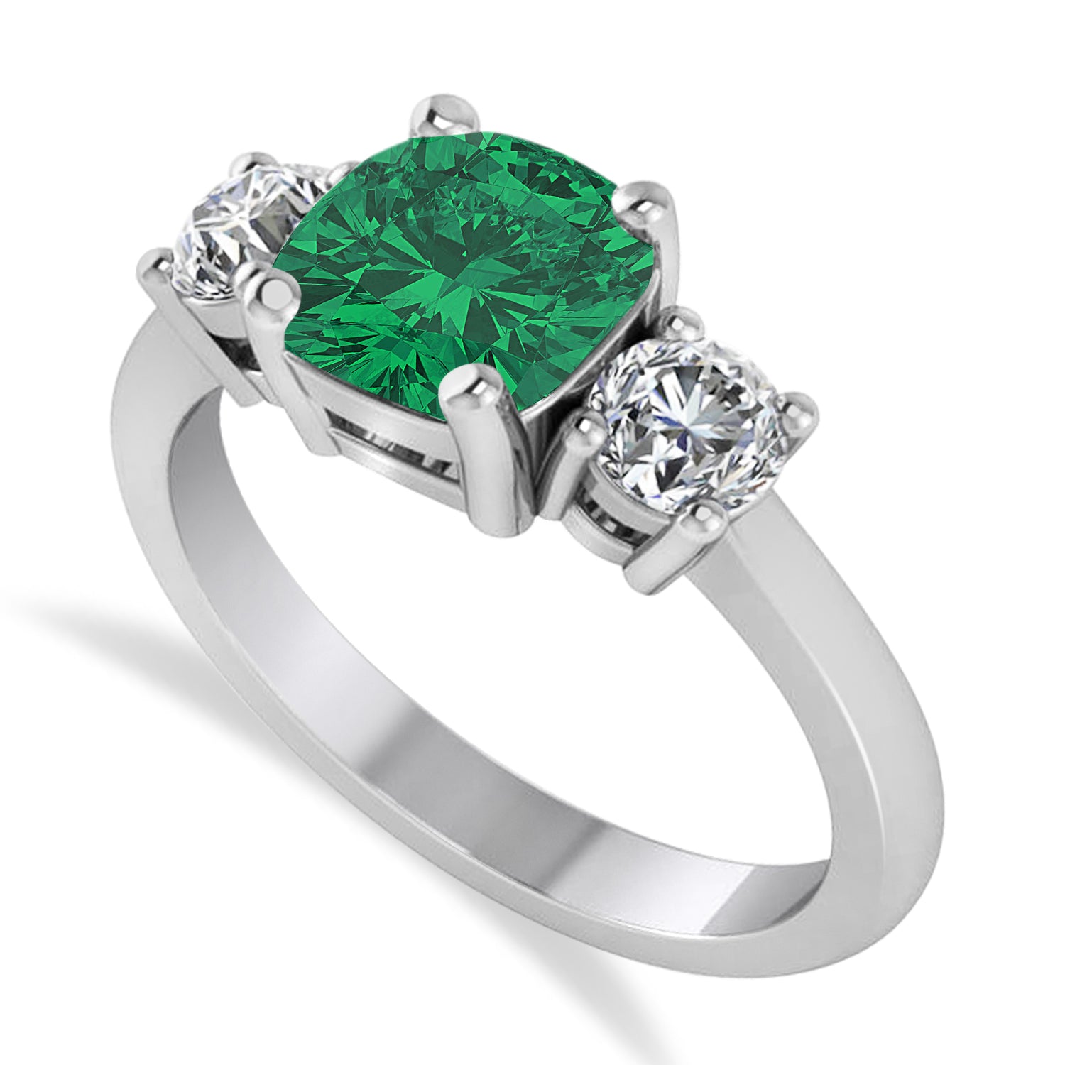 A modern version of a classic style, our cushion and round three-stone emerald and diamond engagement ring features a stunning two-carat cushion-cut green emerald flanked by two round white accent diamonds, all prong set in 14k white gold. Sparkling with color and symbolism, the ring's trio of stones represent friendship, love and fidelity. p>All stones are prong set with a combined 2.50 total carat weight. Diamonds are rated G-H for color and SI1-SI2 for clarity; the emerald is of eye clean clarity.