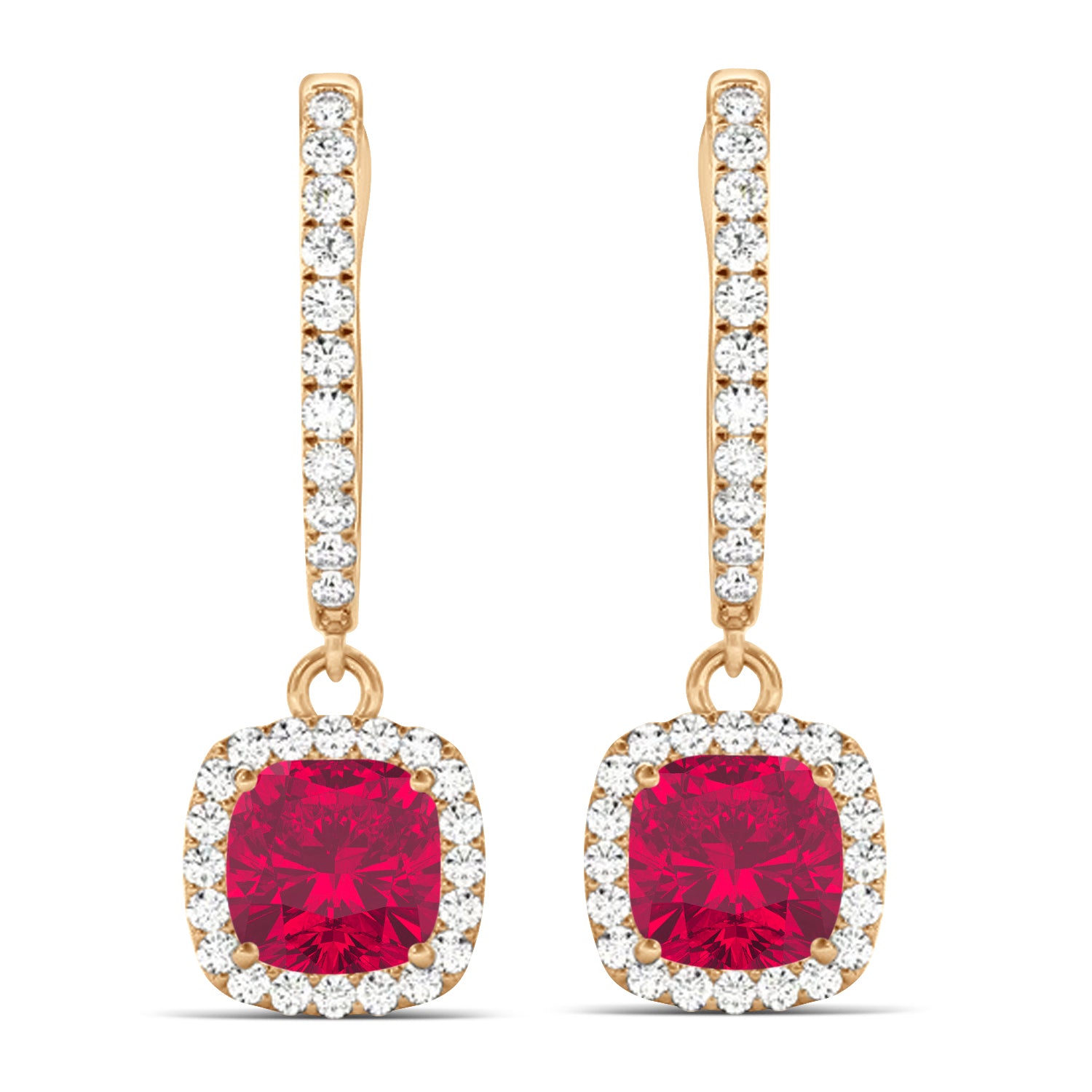 Our Cushion Shape Ruby & Diamond Halo Dangling Earrings come in other metals and are also available set with other precious and semi-precious cushion-shaped stones.