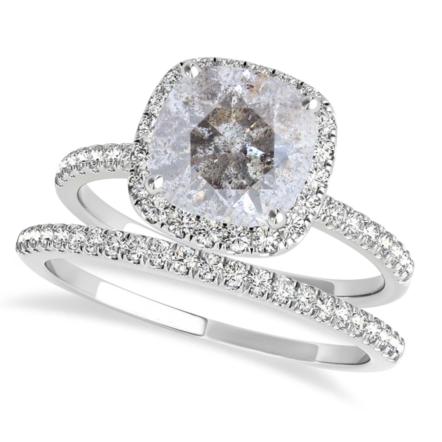Cushion Salt & Pepper Diamond Halo Bridal Set French Pave 18k White Gold 2.14ct