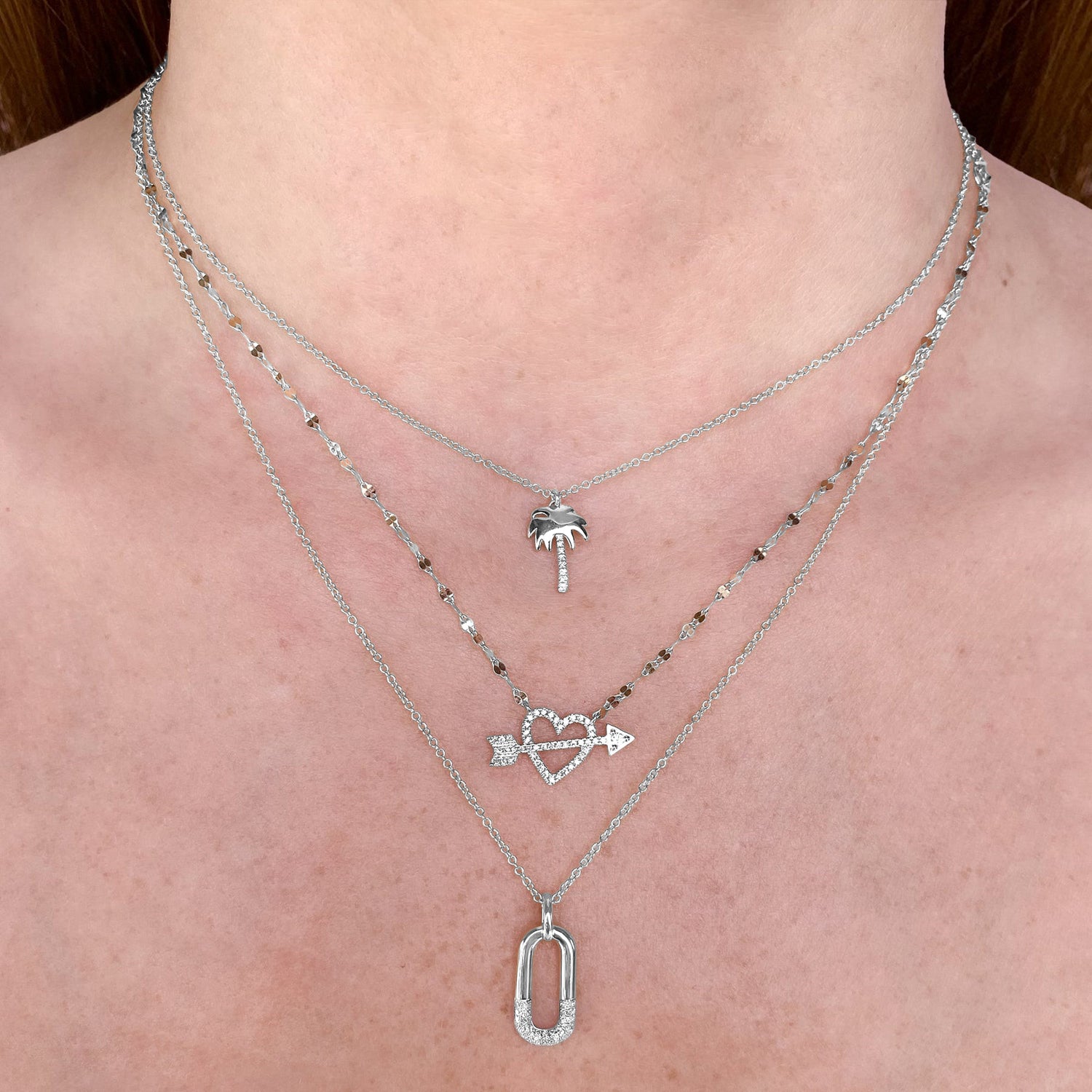 Elevate your style with our diamond-accented heart and arrow pendant necklace in 14K white gold (0.16 ct). This enchanting piece seamlessly combines romance and elegance, featuring meticulously crafted diamond accents that form a captivating heart and arrow design.Crafted in 14K white gold, this necklace exudes timeless sophistication, providing the perfect backdrop for the 0.16-carat diamonds that add a brilliant sparkle.Whether for yourself or as a thoughtful gift, this Diamond Accented Heart & Arrow Pendant Necklace is a stunning addition to any jewelry collection.
