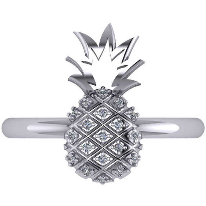 This ring features a diamond accented pineapple sitting on a smooth, 14k white gold band.