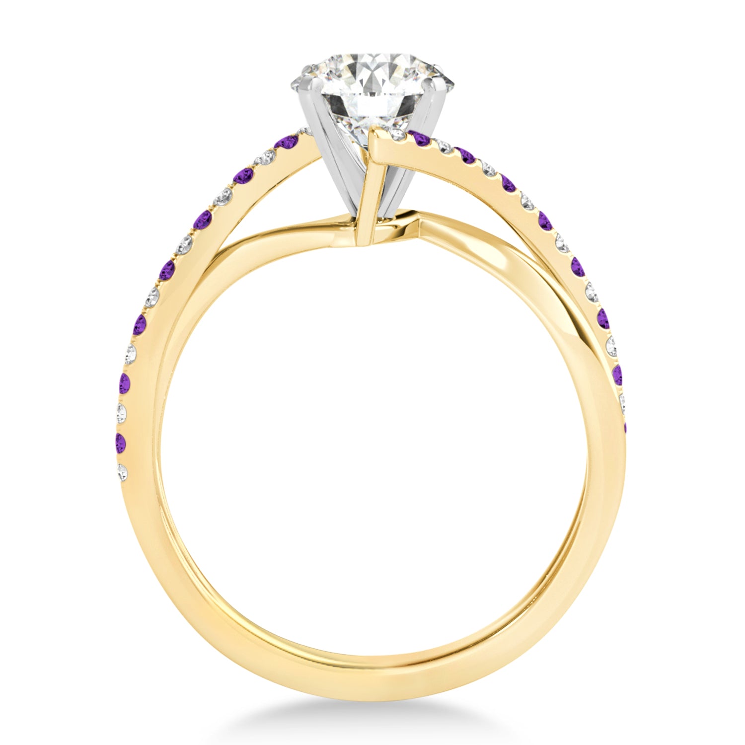 This unique bypass engagement ring setting has a twisted band containing a total of 34 alternating Amethysts & Diamonds on the ring's shank. The diamonds are of G-H color and SI1-SI2 clarity.