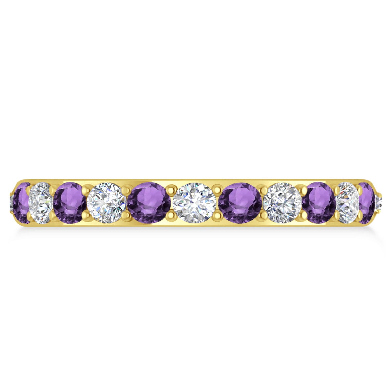 Set in 14k yellow gold, 12, prong-set, round diamonds and 12, prong-set, round amethysts surround the entirety of the wedding band, in a breathtakingly unique style.