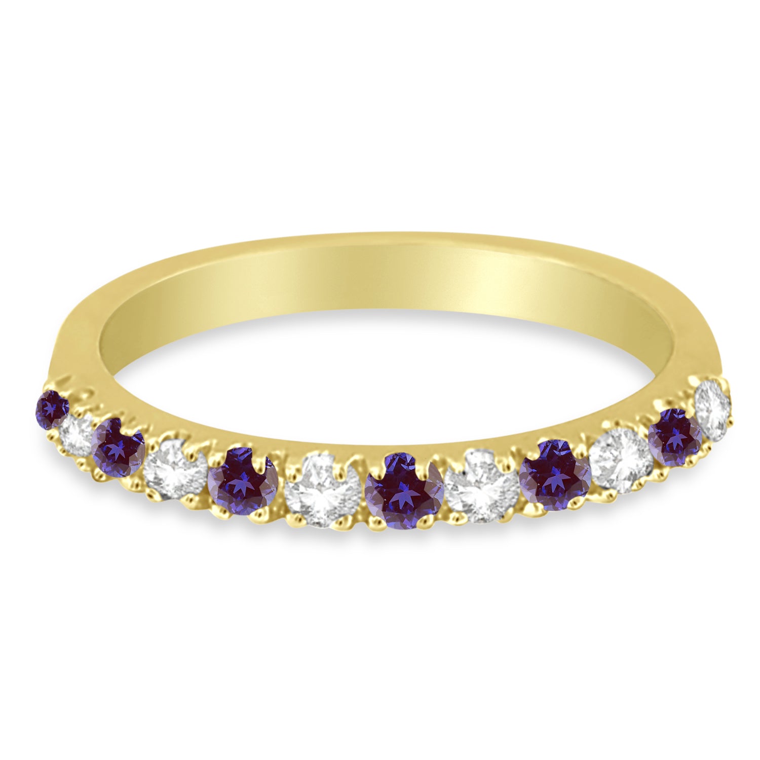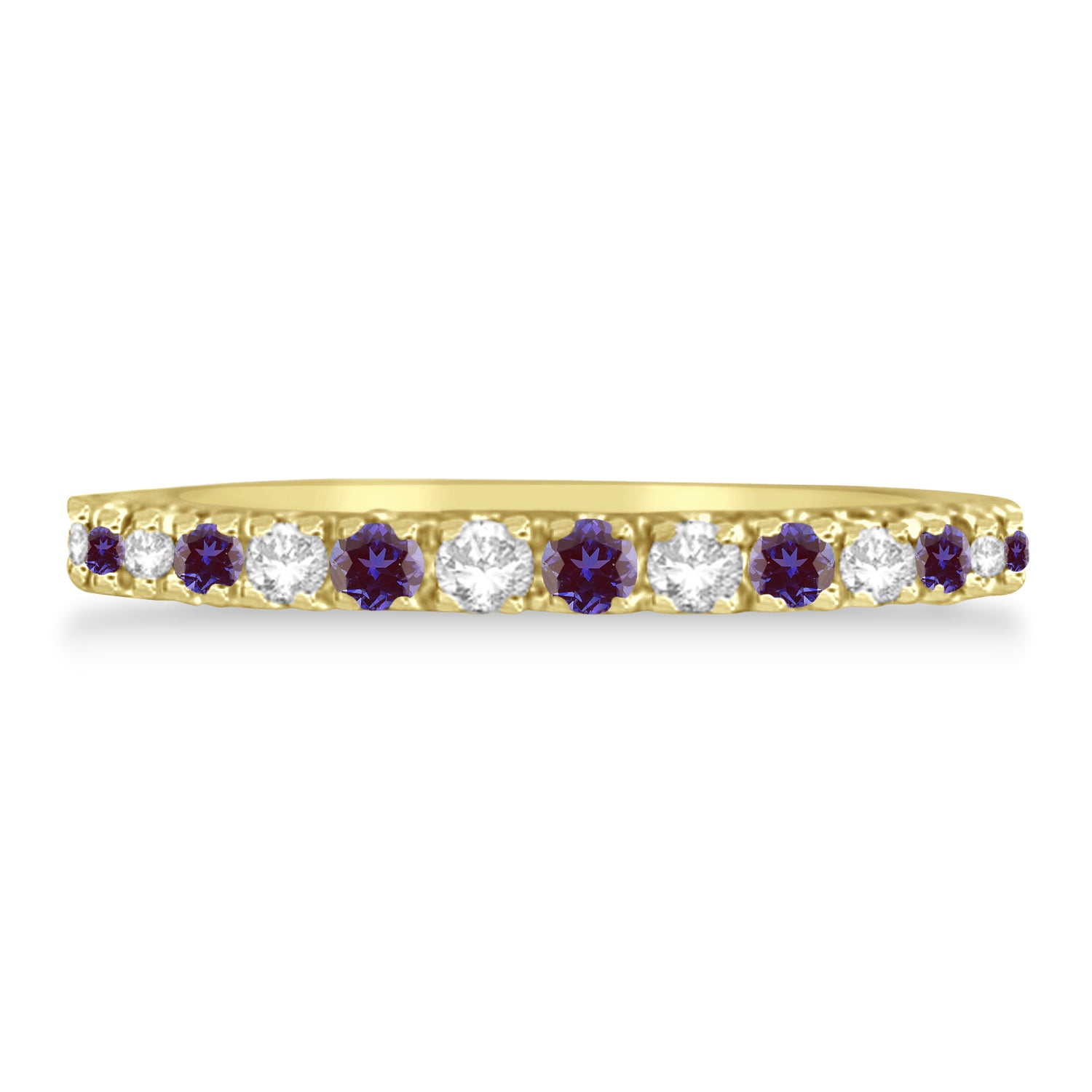 Seven round purple lab alexandrite and six brilliant-cut white round diamonds are circling halfway around this gorgeous gemstone band. The stones are set in a sparkling 14kt yellow gold prong setting.