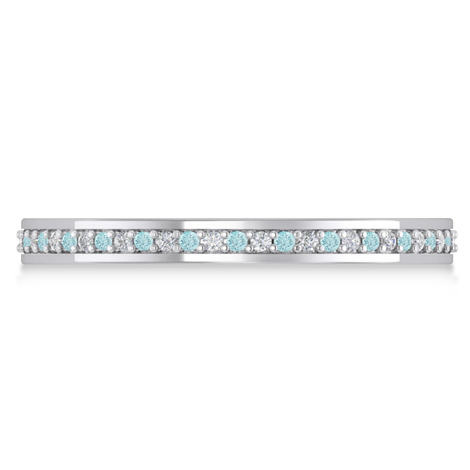 Set in 14k white gold, 28 round diamonds and 28 round aquamarines are prong-set and channel-set around the entirety of the band.