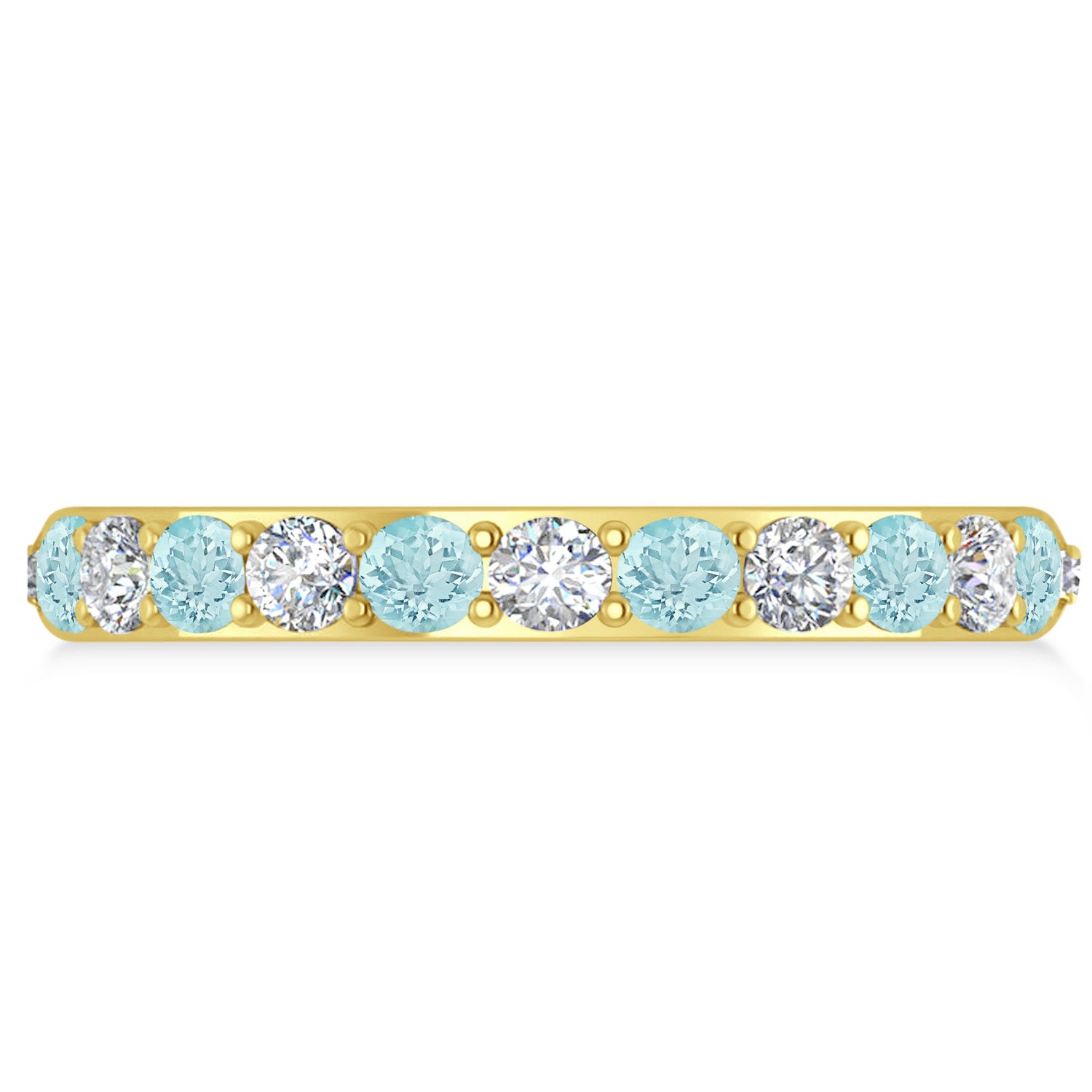 Set in 14k yellow gold, 12, prong-set, round diamonds and 12, prong-set, round aquamarines surround the entirety of the wedding band, in a breathtakingly unique style.