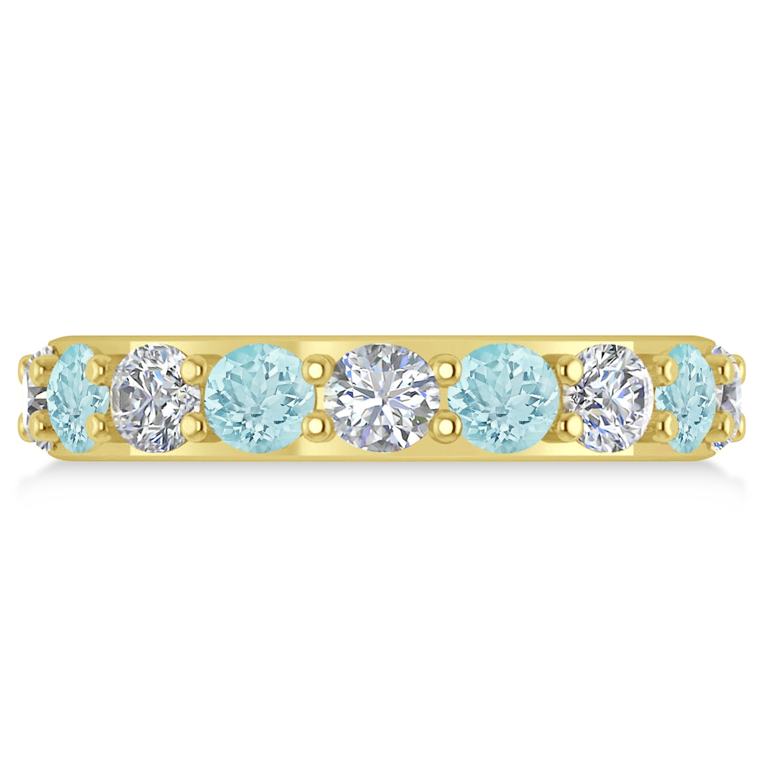 Set in 14k yellow gold, 8, prong-set, round diamonds and 9, prong-set, round aquamarines surround the entirety of the wedding band, in a breathtakingly unique style.