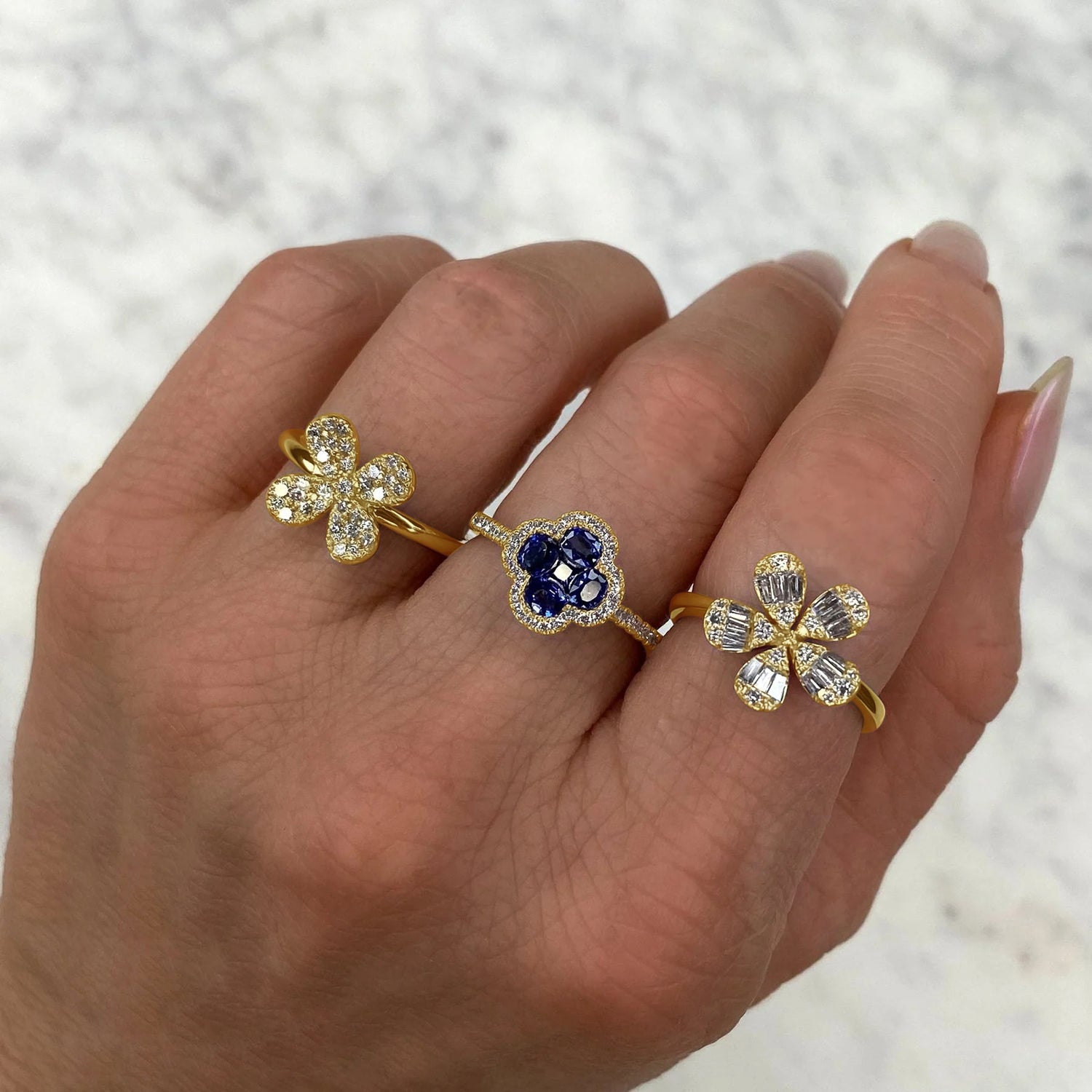 Introducing our stunning Diamond & Blue Sapphire Clover Ring, meticulously crafted in lustrous 14K yellow gold. This enchanting piece features a total carat weight of 1.50, with a captivating combination of sparkling diamonds and vibrant blue sapphires arranged in a charming clover design. Elevate your style with this unique and elegant ring, a perfect expression of sophistication and timeless beauty.