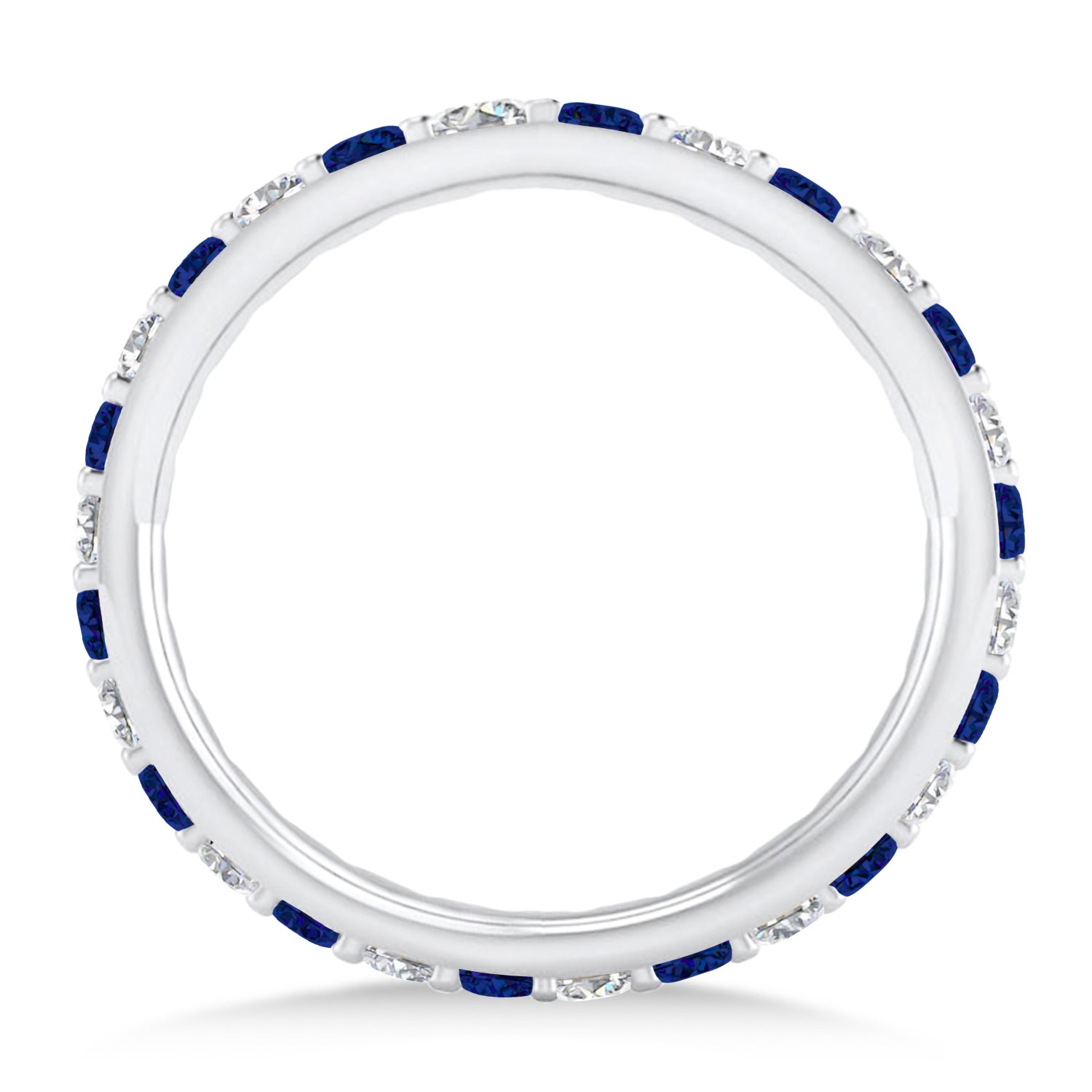 Set in 14k white gold, 14, prong-set, round diamonds and 15, prong-set, round blue sapphires surround the entirety of the thin wedding band, in a breathtakingly unique style.
