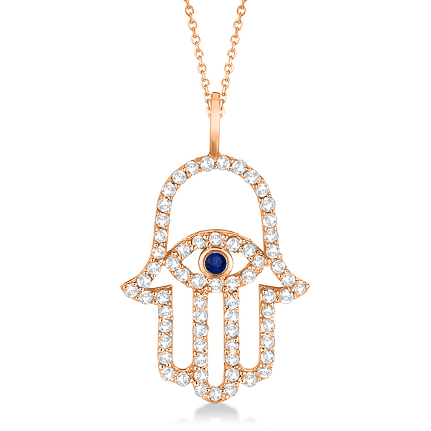 Diamond & Blue Sapphire Hamsa Evil Eye Pendant Necklace 14k Rose Gold
