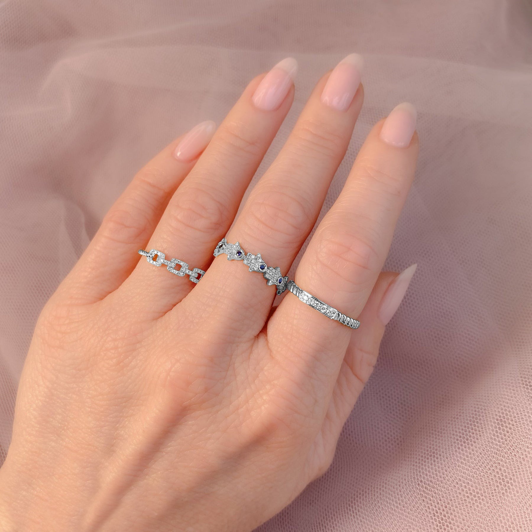 Elevate your personal style with our exquisite "Diamond Accented Blue Sapphire Hamsa Ring in 14K White Gold," a captivating fusion of spiritual symbolism and luxurious design. Crafted with meticulous attention to detail, this ring features a Hamsa motif?a symbol known for bringing protection and good fortune.Designed for both fashion and meaning, this ring is a versatile accessory suitable for everyday wear or special occasions. The 14K white gold setting enhances the overall elegance and timelessness of the piece.