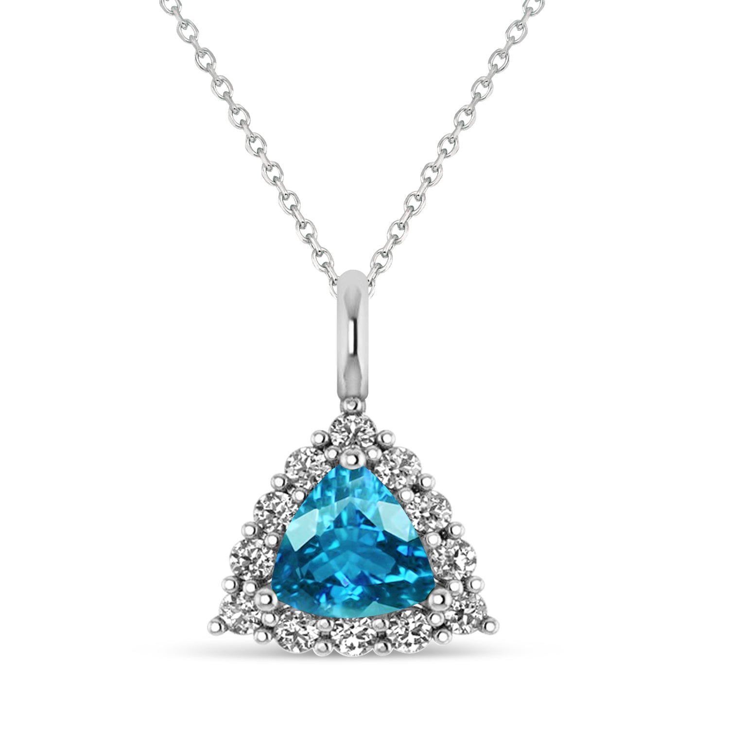 This pendant features a trillion cut diffused Blue Topaz framed by a diamond halo diamond accents on the pendant loop. This pendant necklace is set in 14k White Gold, has a total weight of 1.6ct., and comes along with your choice of a 16 or 18 inch long matching gold chain.