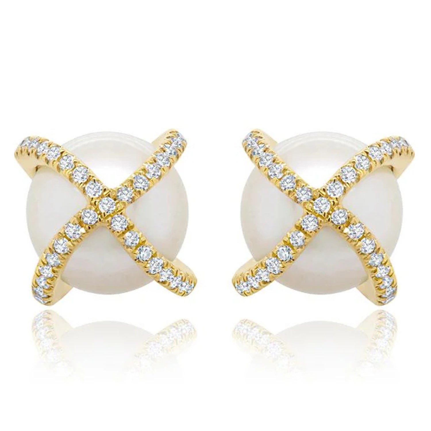 Diamond & Cultured Pearl Crisscross Stud Earrings 14K Yellow Gold (0.21ct)