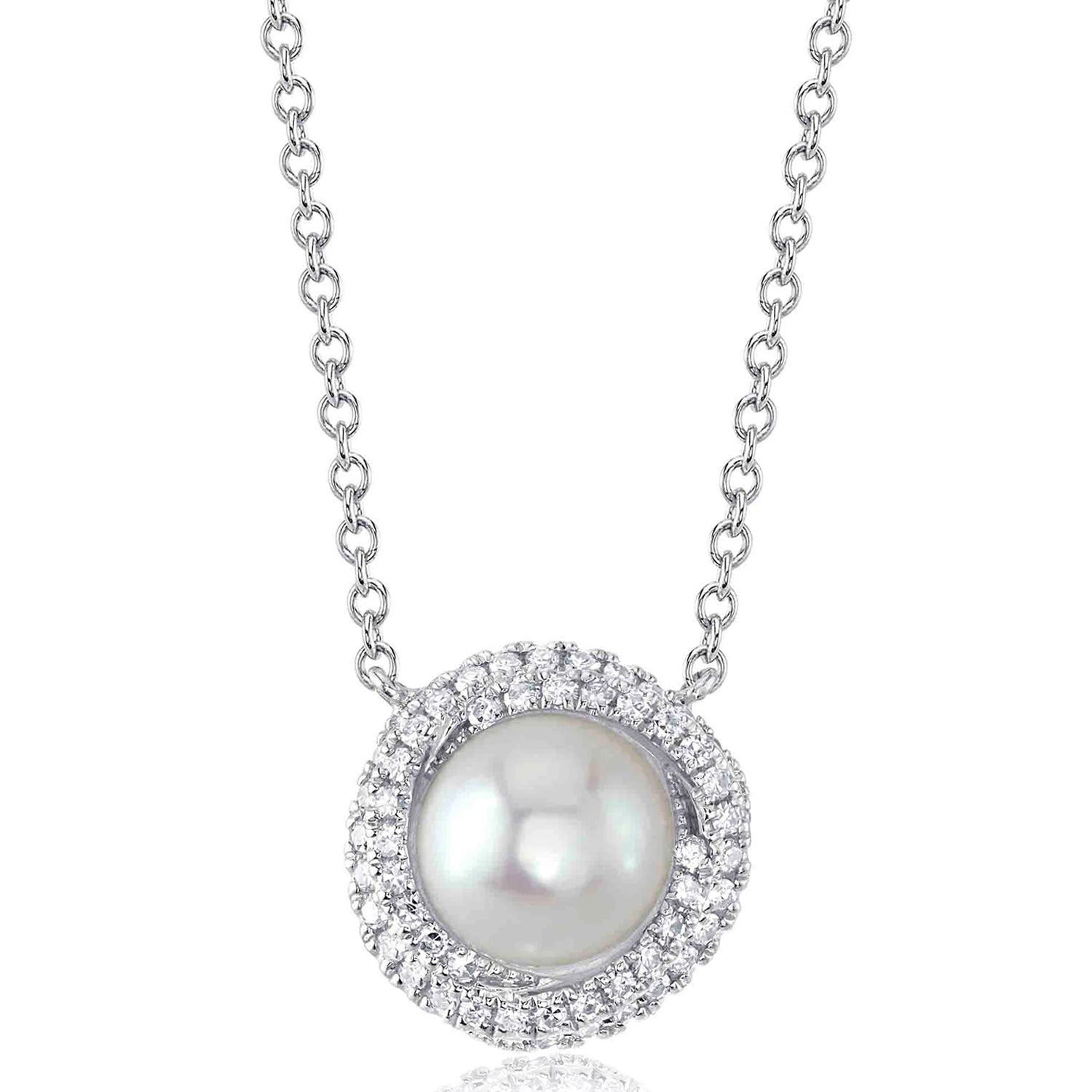 Diamond & Cultured Pearl Halo Pendant Necklace 14K White Gold (0.13ct)
