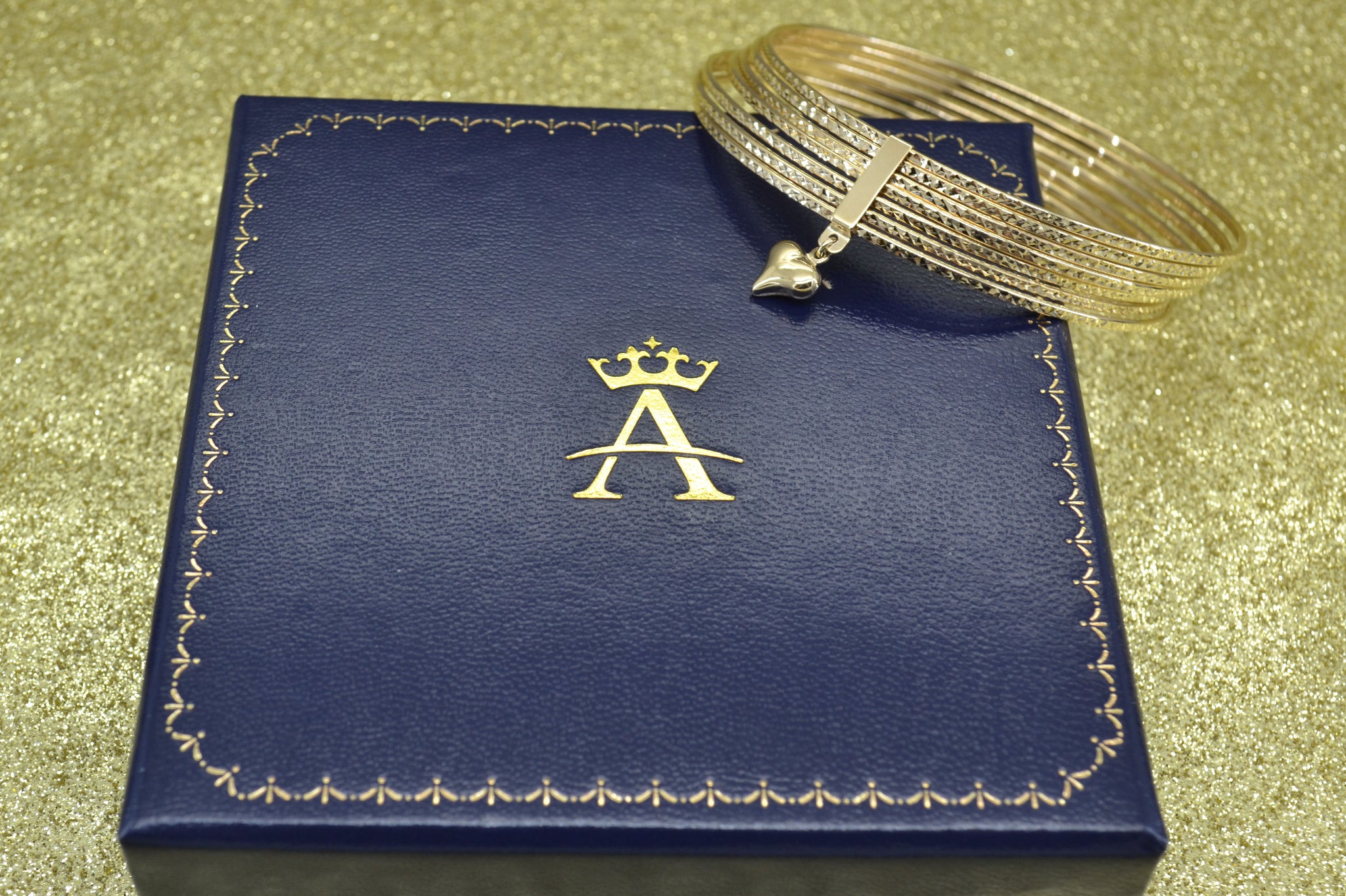 At 1mm wide each, these dainty diamond-cut bangles total 10.79 grams of weight, and are held together by a smooth band with an attached small charm. This smooth band ensures that the bangles stay in the set, and don't fall up your arm individually.