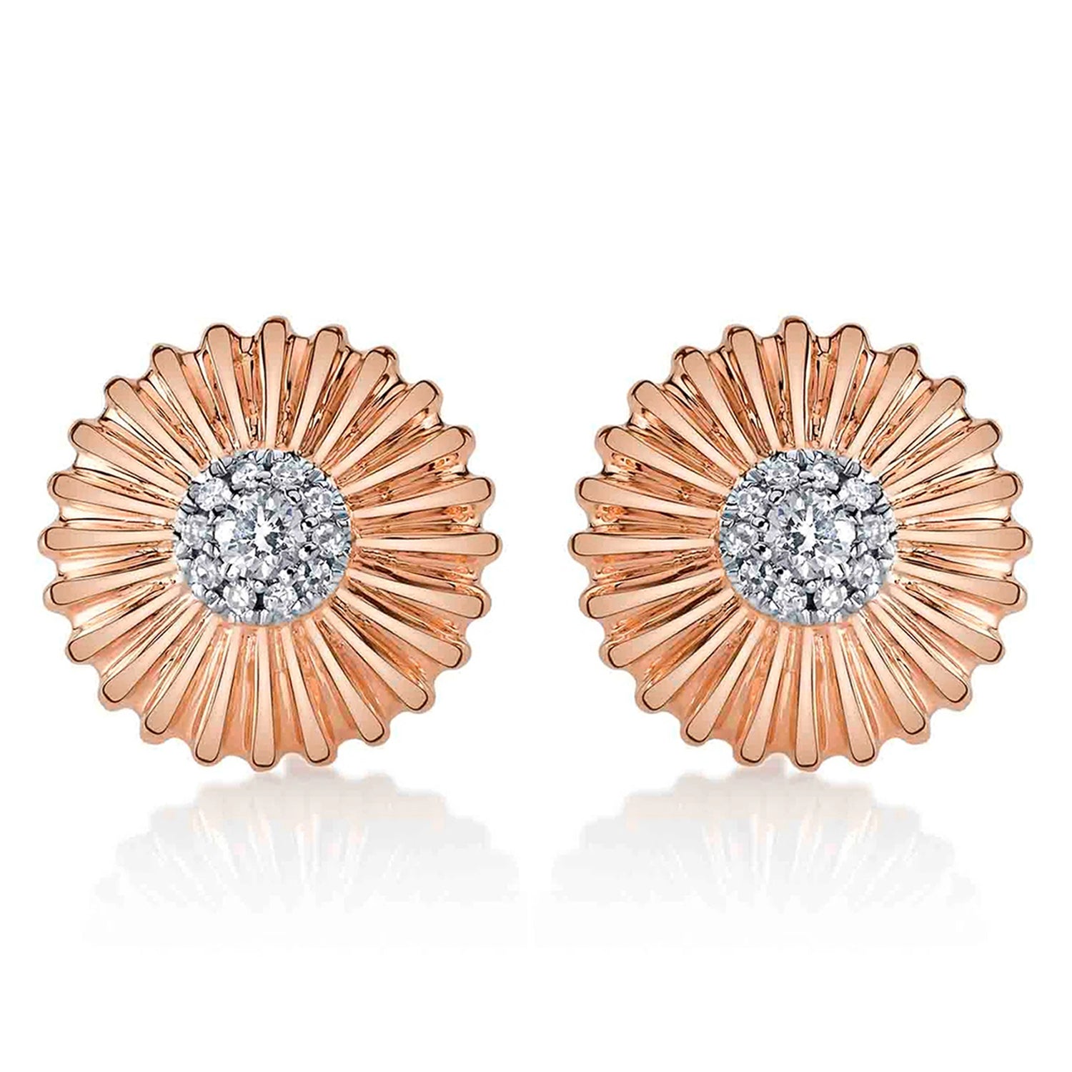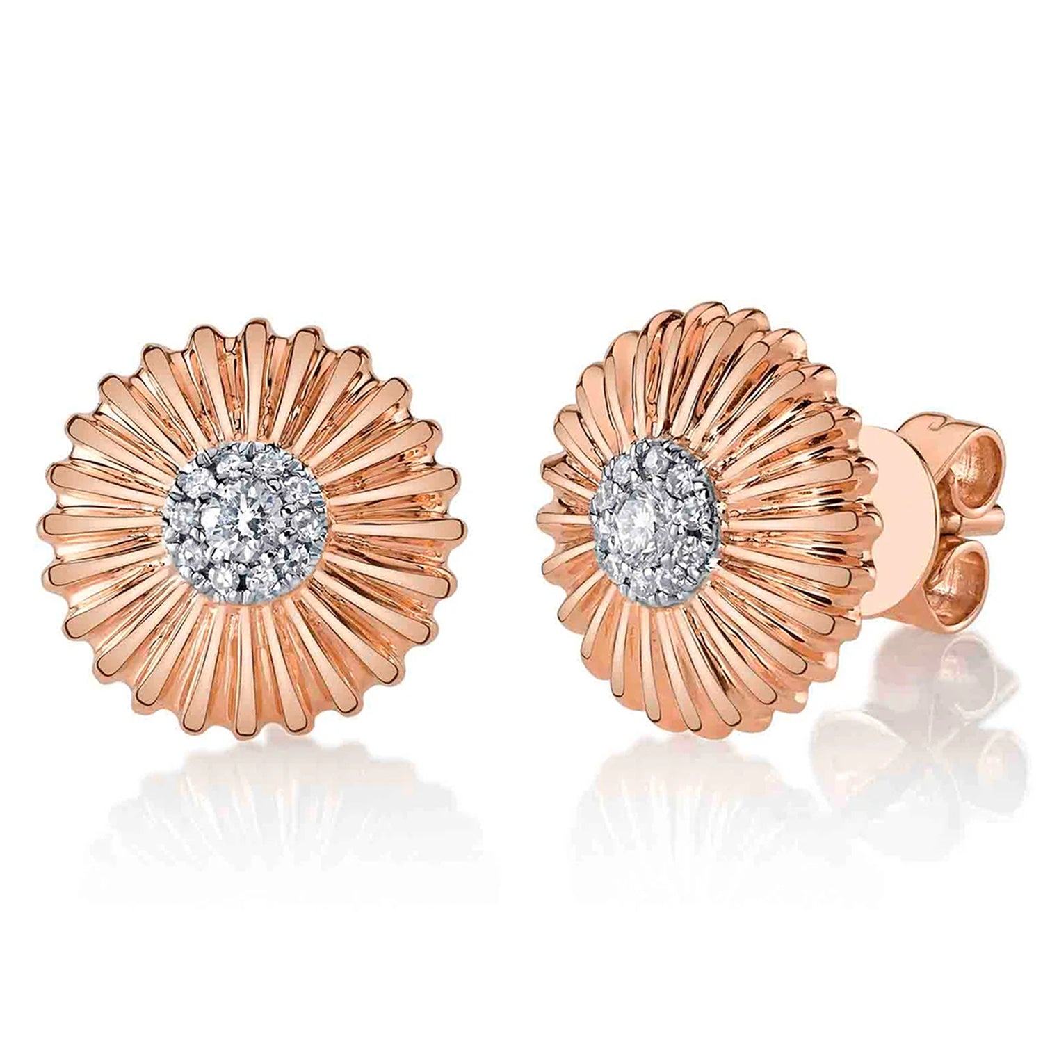 Upgrade your style with our elegant Diamond Daisy Flower Stud Earrings. Crafted from luxurious 14K rose gold, these nature inspired earrings showcase an elegant daisy flower design encrusted with dazzling diamonds totaling 0.14 carats. Versatile and timeless, these earrings are the perfect accessory to elevate any ensemble, adding a touch of sophistication and sparkle to your look. These exquisite earrings feature the delicate petals that mimic the sunflowers cheerful bloom. Perfect for both casual and formal occasions, these stud earrings are a must-have addition to your jewelry collection.