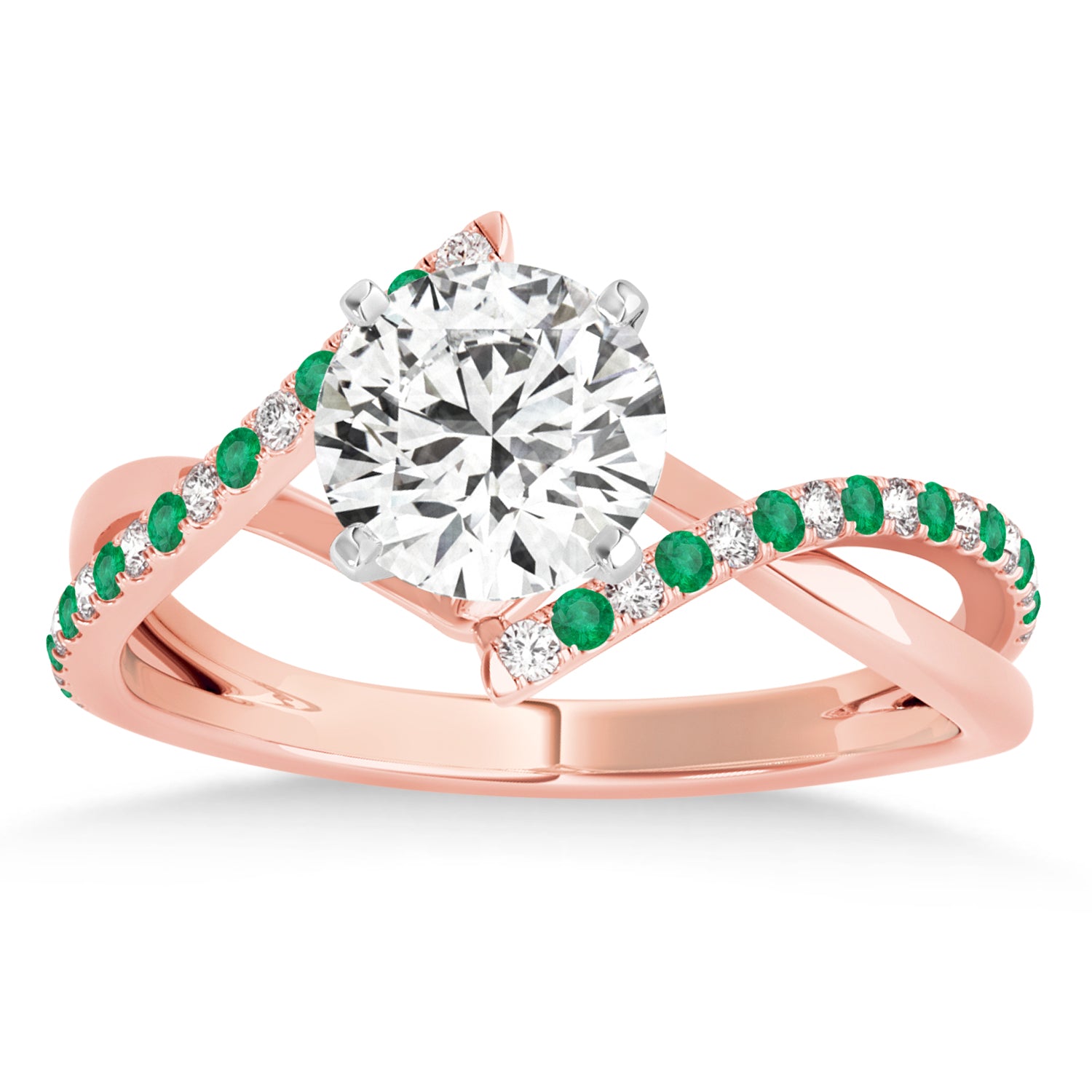 This unique bypass engagement ring setting has a twisted band containing a total of 34 alternating Emeralds & Diamonds on the ring's shank. The diamonds are of G-H color and SI1-SI2 clarity.