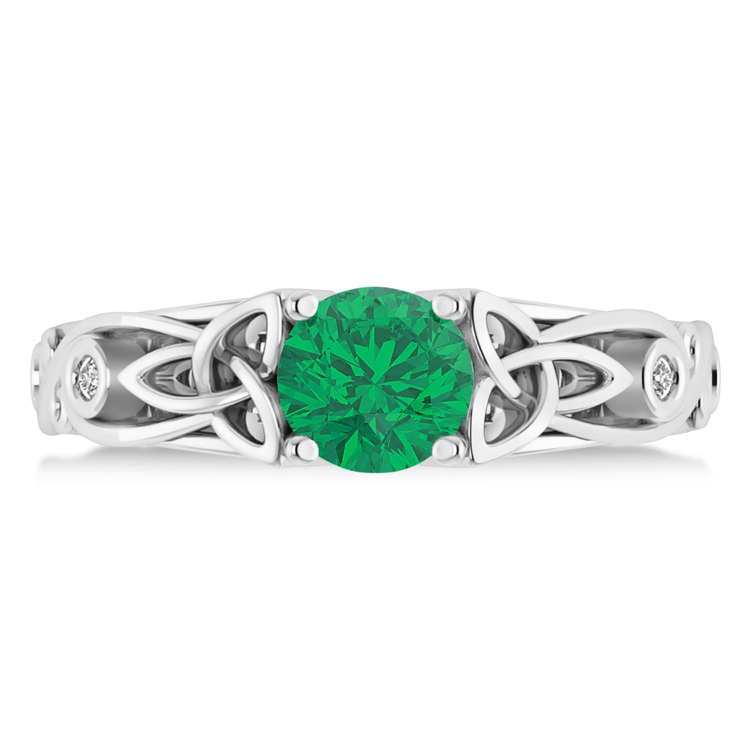 A fabulous green emerald is framed by the sparkle of round bezel-set accent diamonds in this beautiful engagement ring. Fashioned in 14k white gold, the ring's decorative band features a Celtic Trinity knot, also known as the Irish Love Knot, whose intertwining lines are said to represent eternal love.