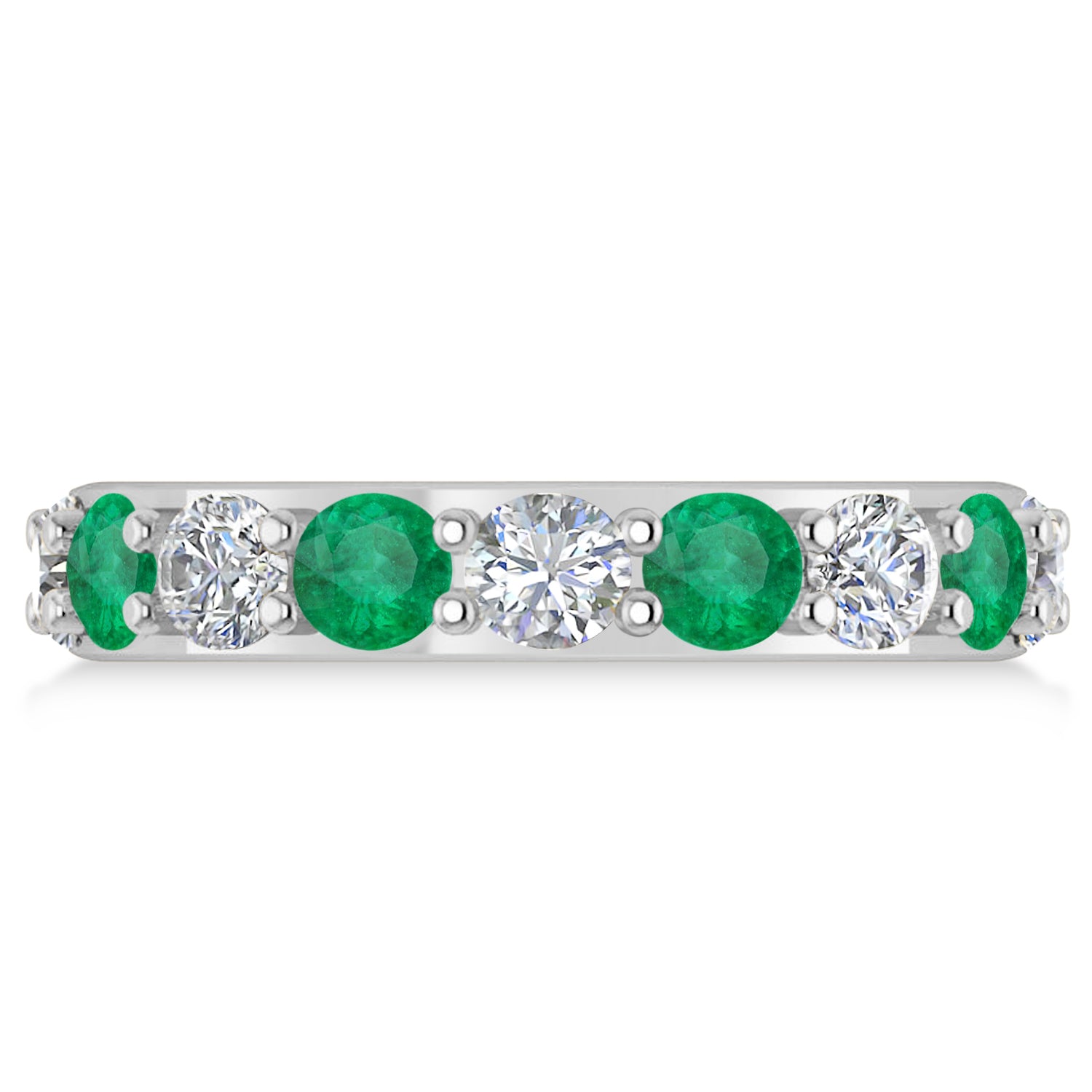 Set in 14k white gold, 8, prong-set, round diamonds and 9, prong-set, round emeralds surround the entirety of the wedding band, in a breathtakingly unique style.