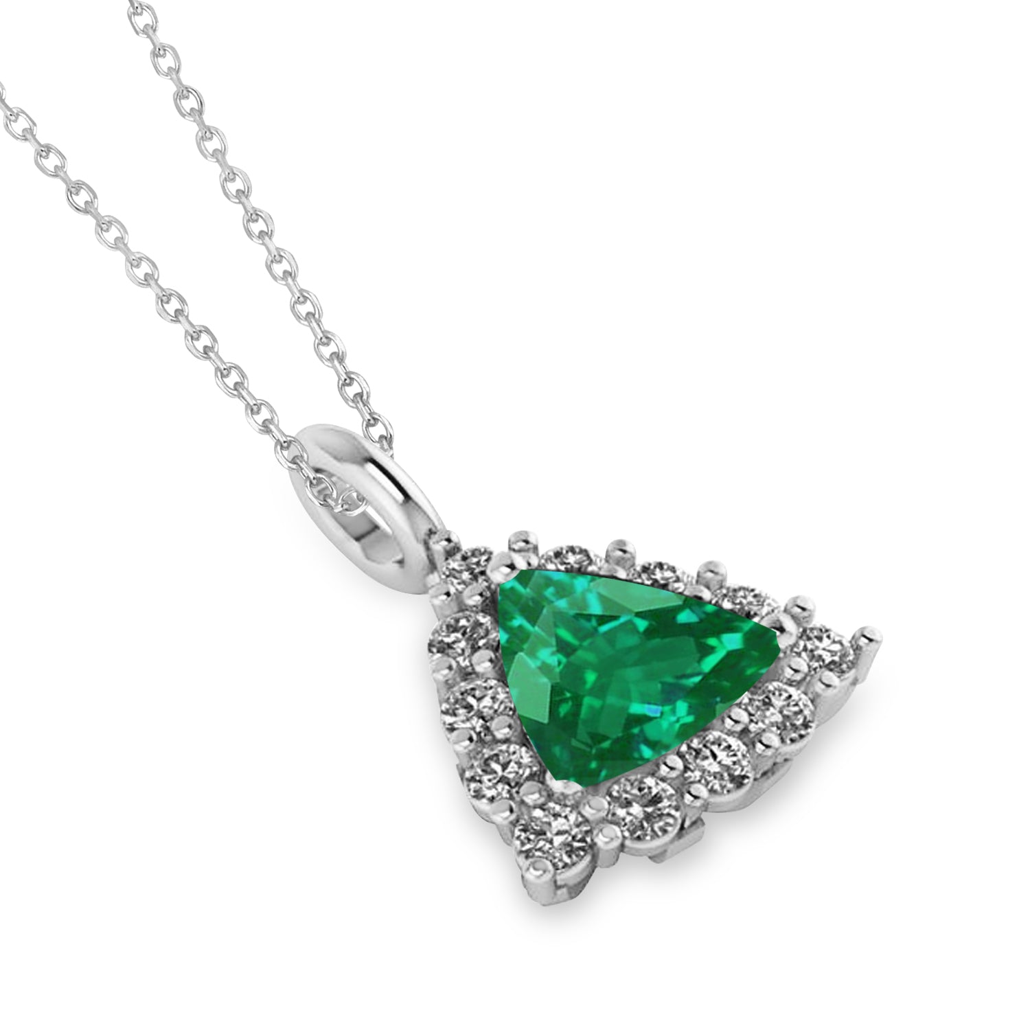 This pendant features a trillion cut diffused Emerald framed by a diamond halo diamond accents on the pendant loop. This pendant necklace is set in 14k White Gold, has a total weight of 1.28ct., and comes along with your choice of a 16 or 18 inch long matching gold chain.