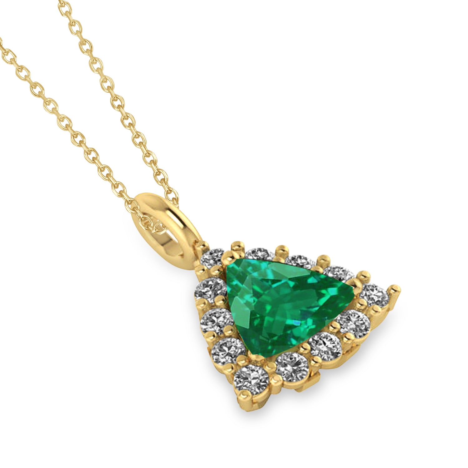 This pendant features a trillion cut diffused Emerald framed by a diamond halo diamond accents on the pendant loop. This pendant necklace is set in 14k Yellow Gold, has a total weight of 1.28ct., and comes along with your choice of a 16 or 18 inch long matching gold chain.