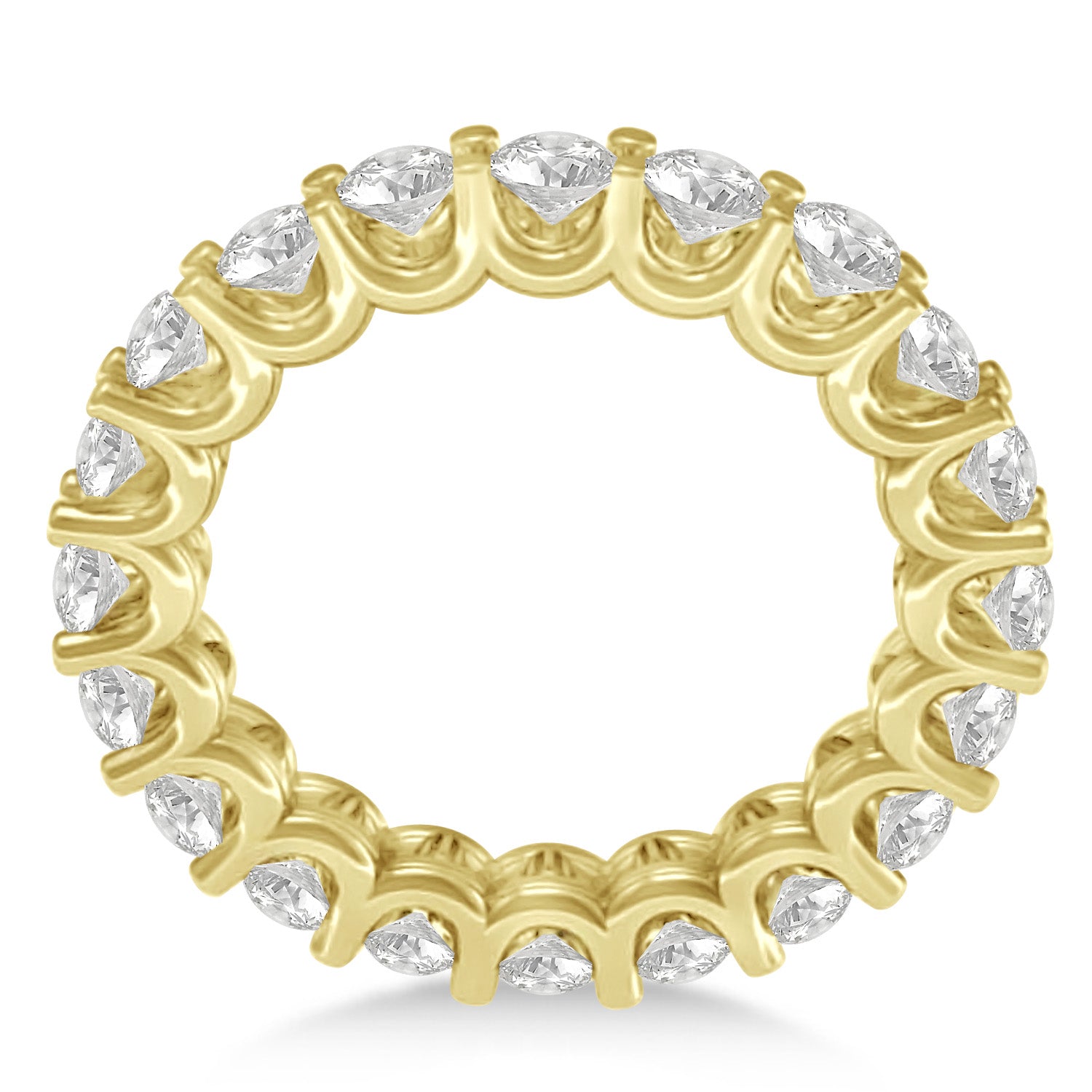 Set in 14k yellow gold, 20 diamonds surround the entirety of this eternity band, in a prominent, prong-set setting.