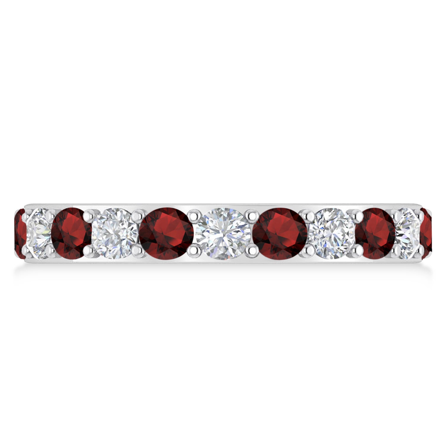 Set in 14k white gold, 11, prong-set, round diamonds and 11, prong-set, round garnets surround the entirety of the wedding band, in a breathtakingly unique style.