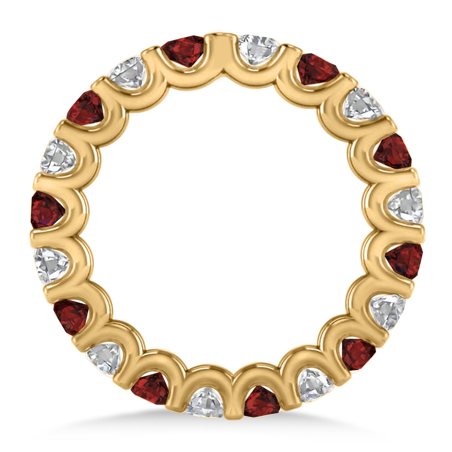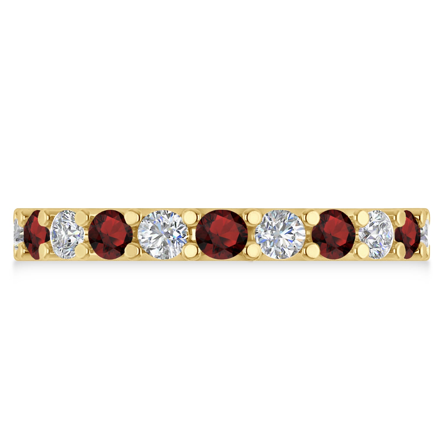 Set in 14k yellow gold, 10 diamonds and 11 garnets surround the entirety of this eternity band, in a prominent, prong-set setting.