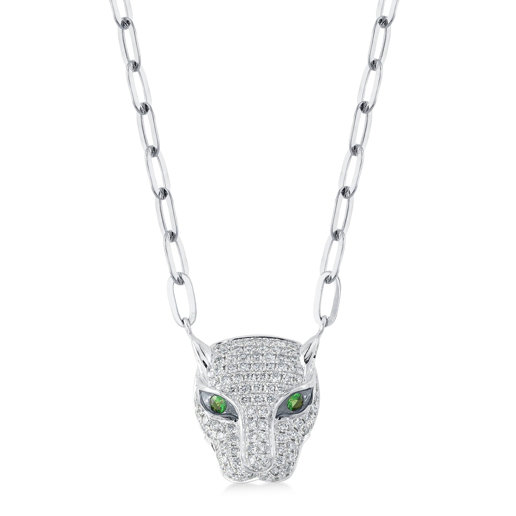 Diamond & Green Garnet Panther Paper Clip Pendant Necklace 14K White Gold (0.56ct)