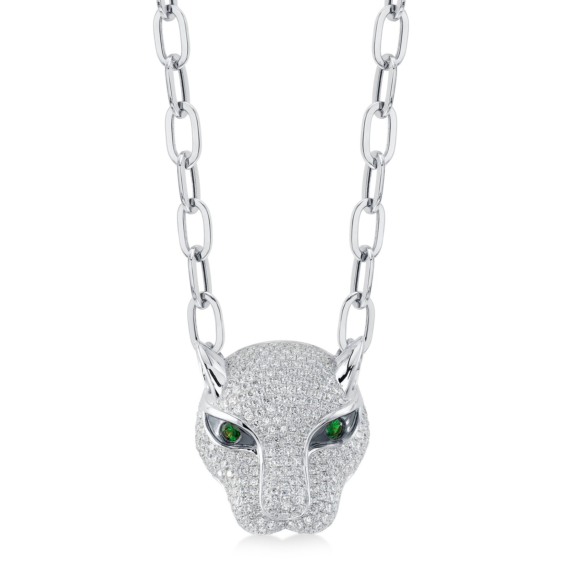 Diamond & Green Garnet Panther Paper Clip Pendant Necklace 14K White Gold (3.53ct)