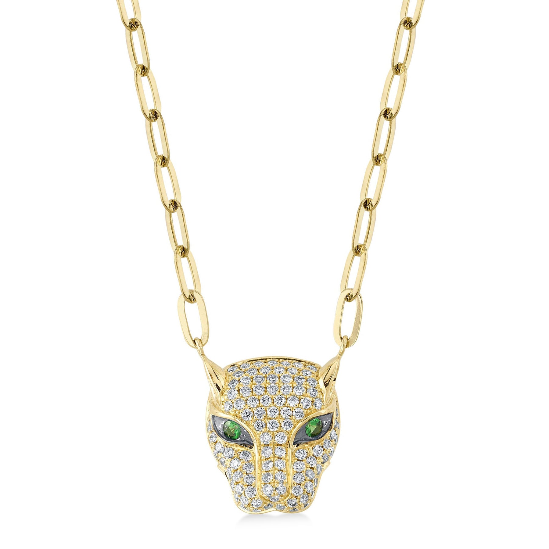 Unleash your inner strength with our Diamond & Green Garnet Panther Paper Clip Pendant Necklace. Crafted in radiant 14K Yellow Gold, adorned with alluring green garnets of 0.07 carats and 0.49 carats of sparkling diamonds. This unique piece combines elegance and fierceness, making it a captivating addition to any jewelry collection