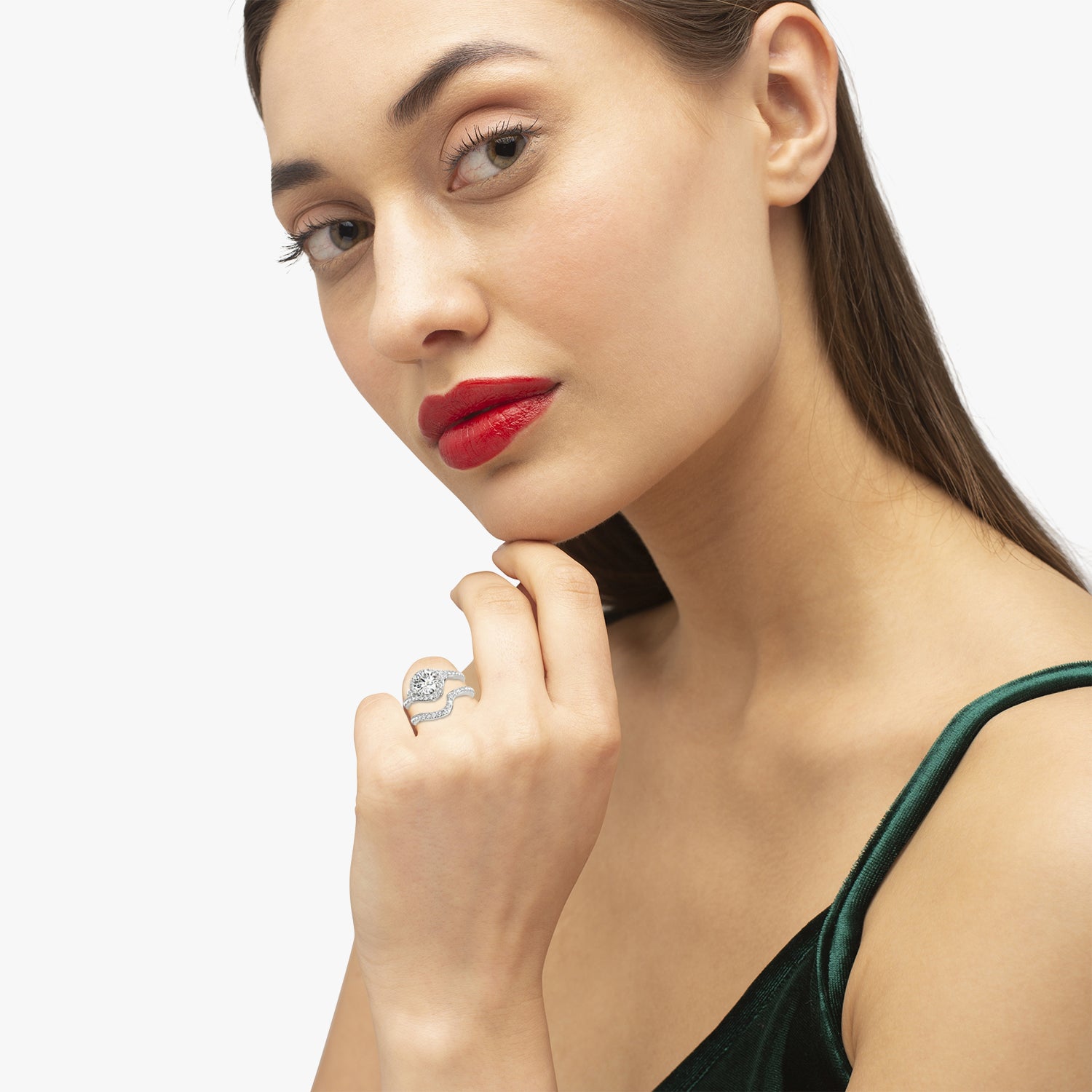 34 prong-set diamonds travel up the top of the engagement ring band and form a halo swirl around the diamond of your choosing, and two slightly larger accent diamonds sit on either side of the main stone.